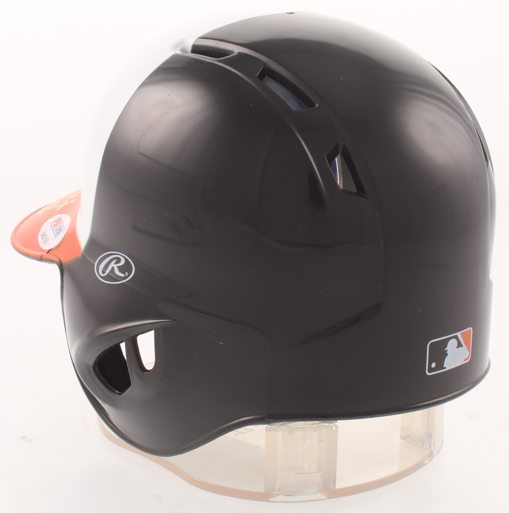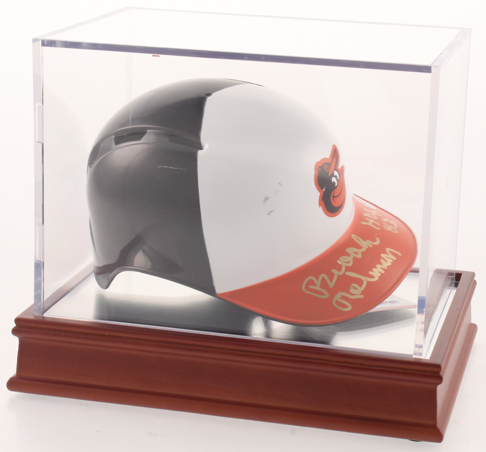 Baltimore Orioles baseball batting mini helmet. Hand-signed in gold paint pen by Brooks Robinson (HOF). Includes display case as shown. Please note that the stand is for display purposes only and is not included with the auction and see photos for details regarding the condition of the helmet.