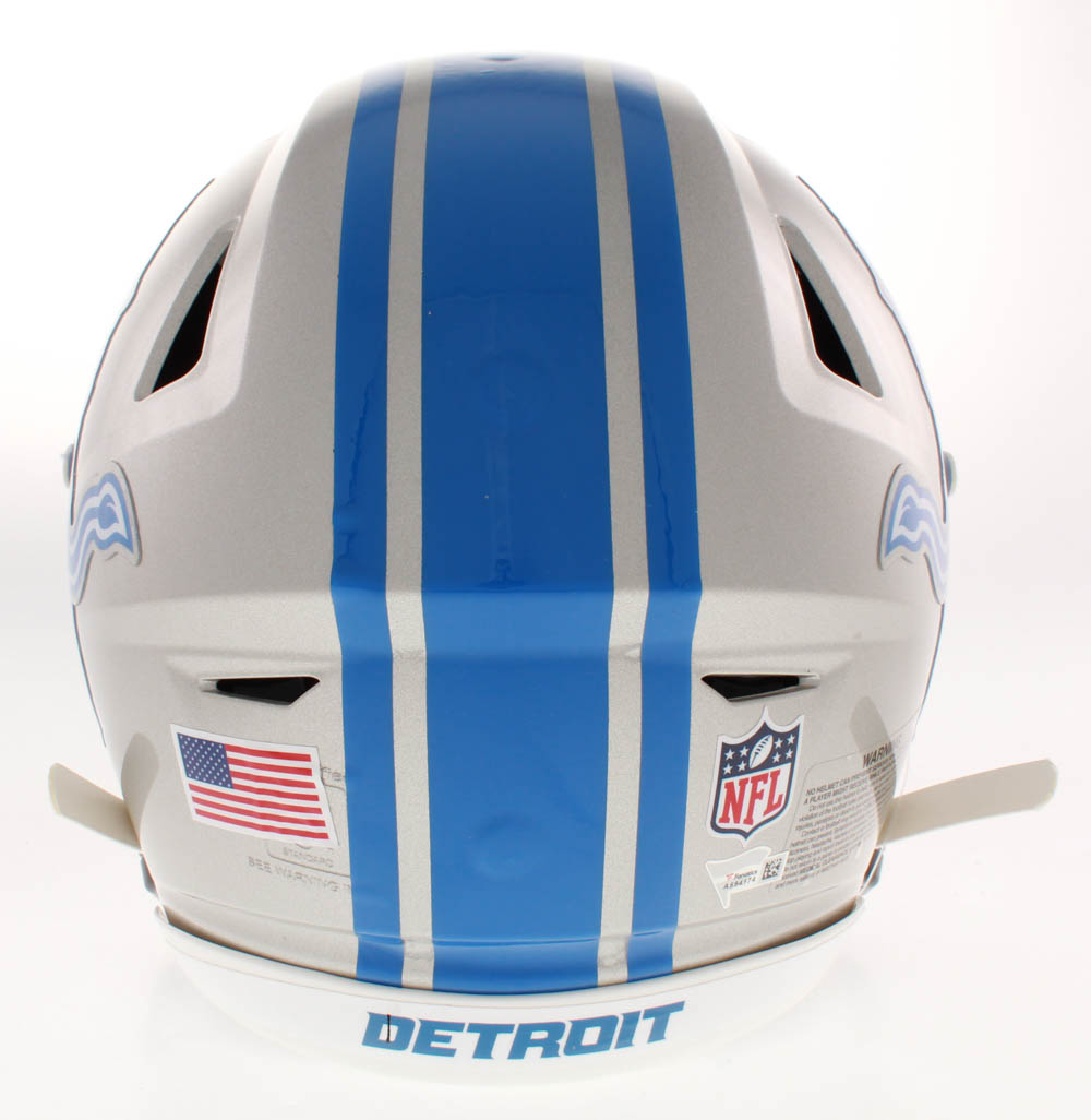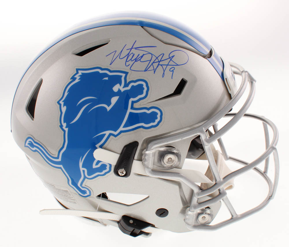 Riddell Detroit Lions full-size authentic on-field speedflex helmet. Hand-signed in blue paint pen by Matthew Stafford.