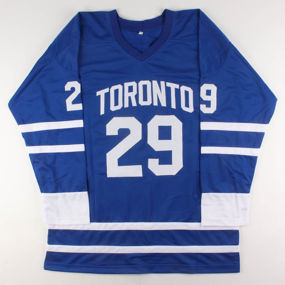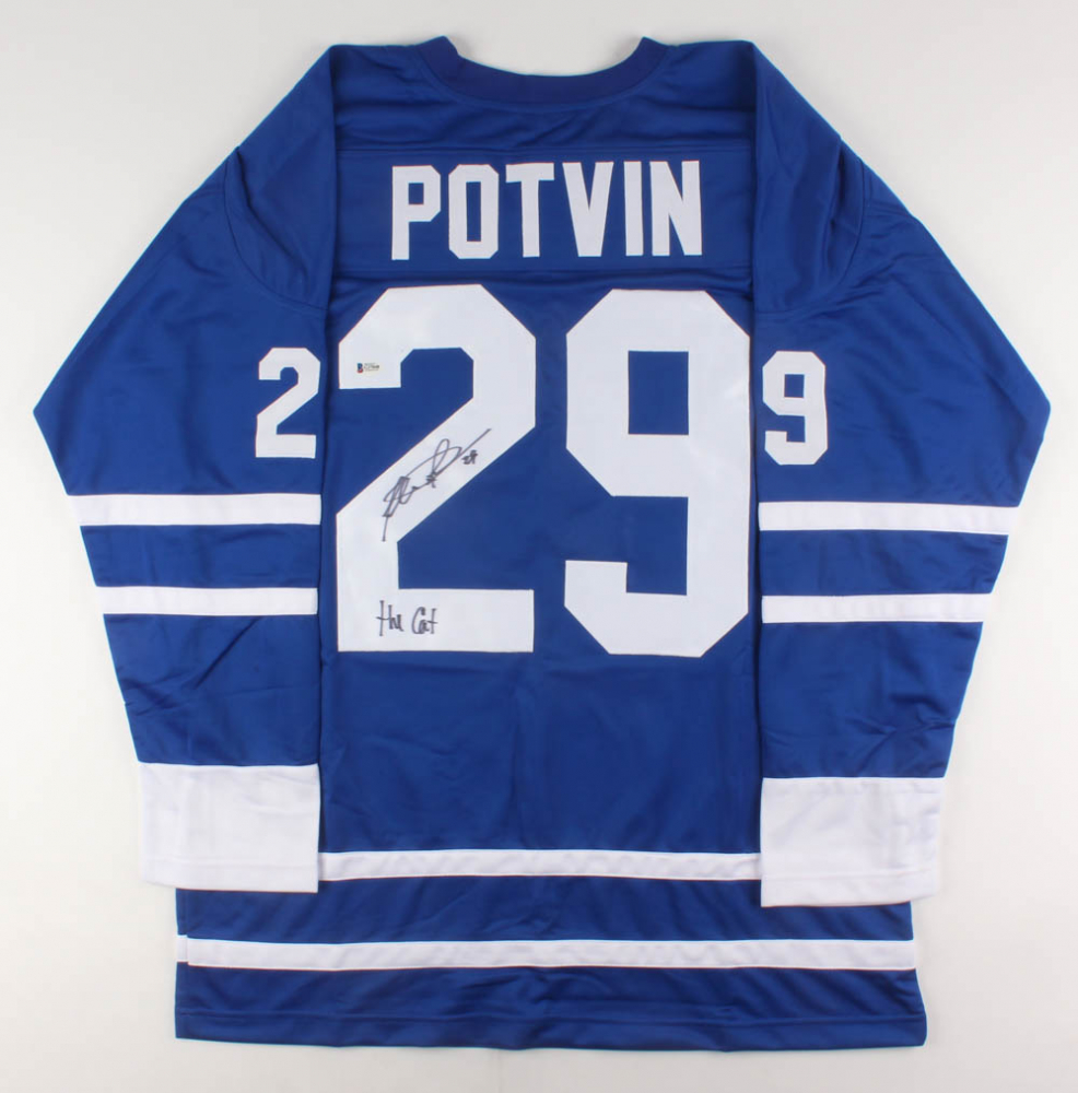 Custom on-ice style jersey. Everything sewn on, size XL. Hand-signed in black felt-tip pen by Felix Potvin.