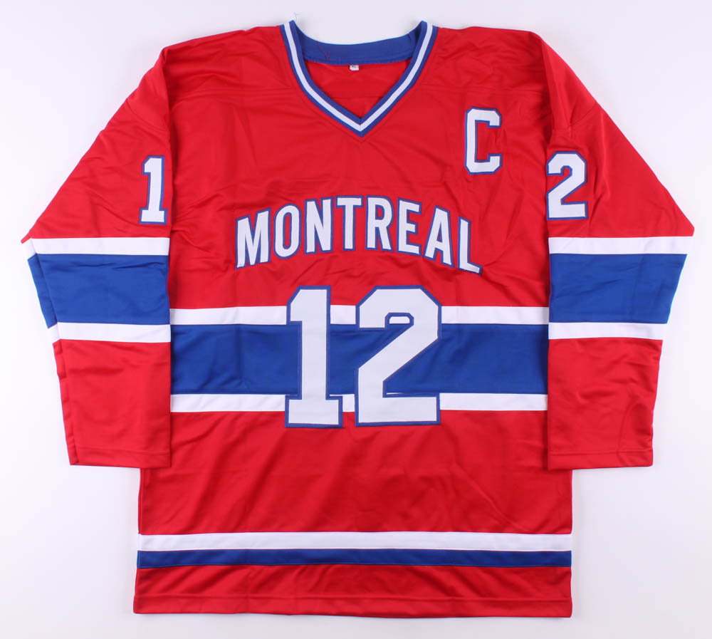 Custom on-ice style jersey. Everything is sewn on, size XL. Hand-signed and inscribed in black felt-tip pen by Yvan Cournoyer (HOF).