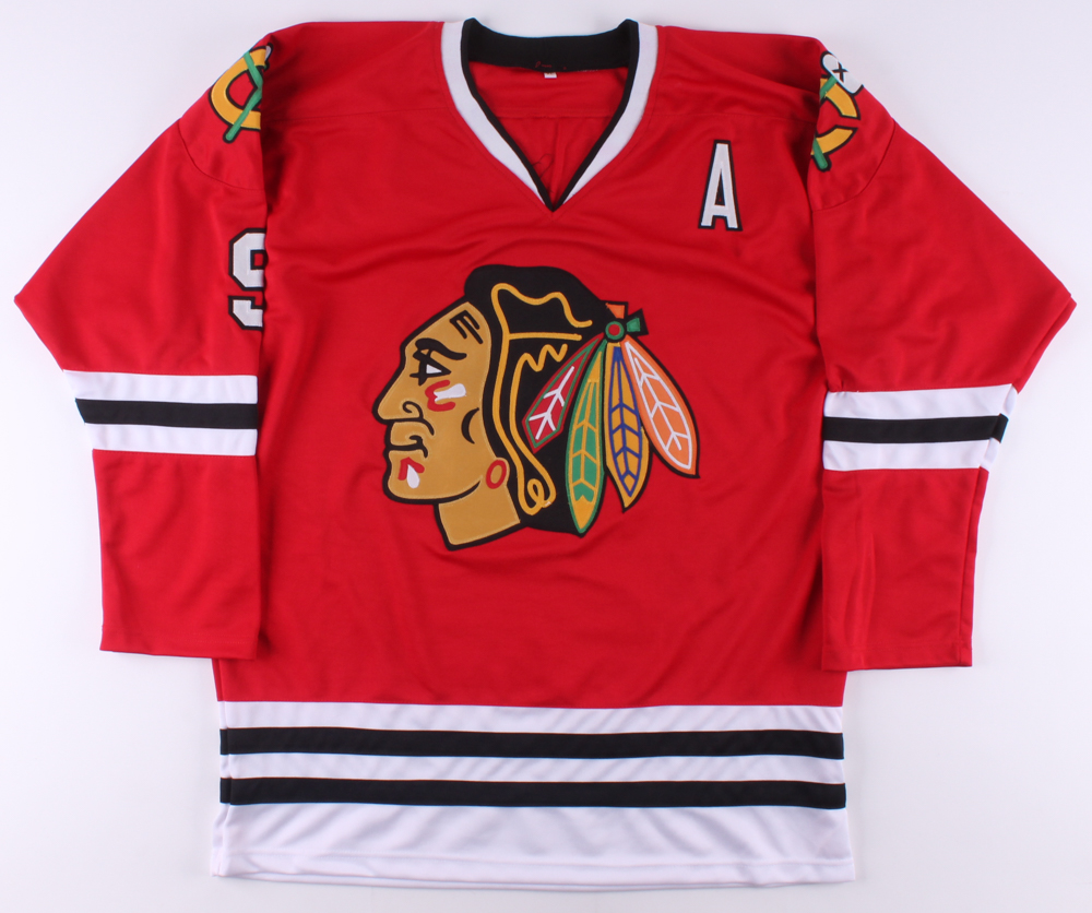 Custom on-field style jersey with everything sewn on, size XL. Jersey has been hand-signed in black felt-tip pen by Bobby Hull (HOF). Hull's career highlights have been custom stitched onto the back of the jersey below the reverse numbers.