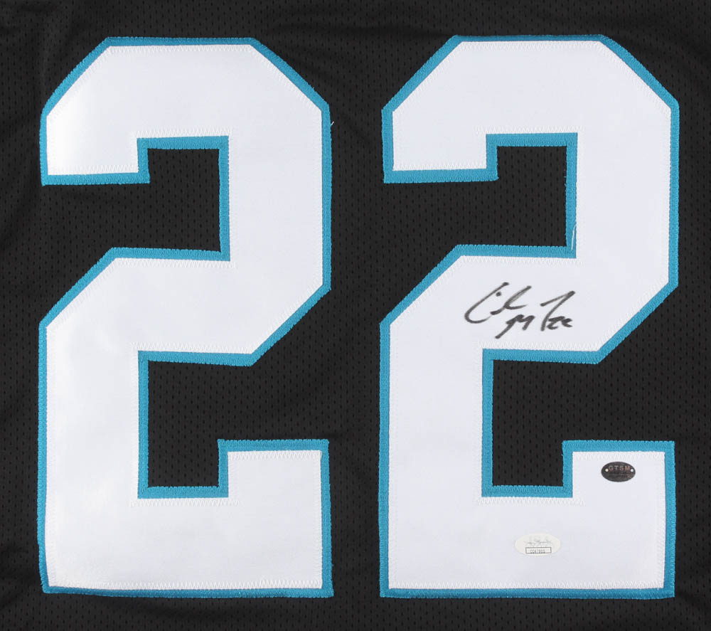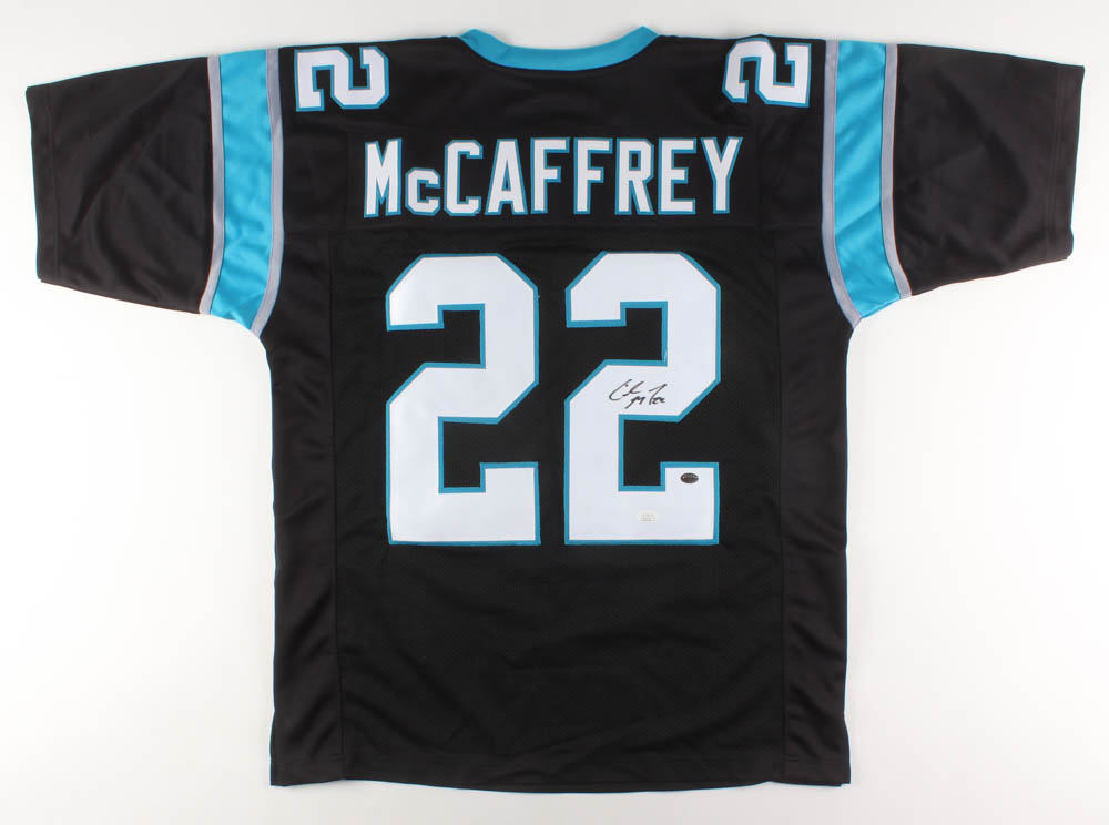 Custom on-field style jersey. Everything is sewn on, size XL. Hand-signed in black felt-tip pen by Christian McCaffrey. Please see scans for further details regarding condition.