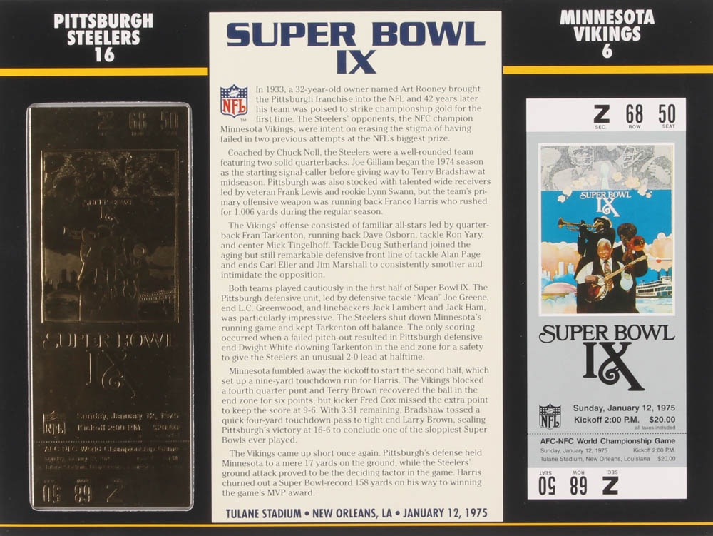 Super Bowl IX Commemorative Score Card with 23kt Gold Ticket