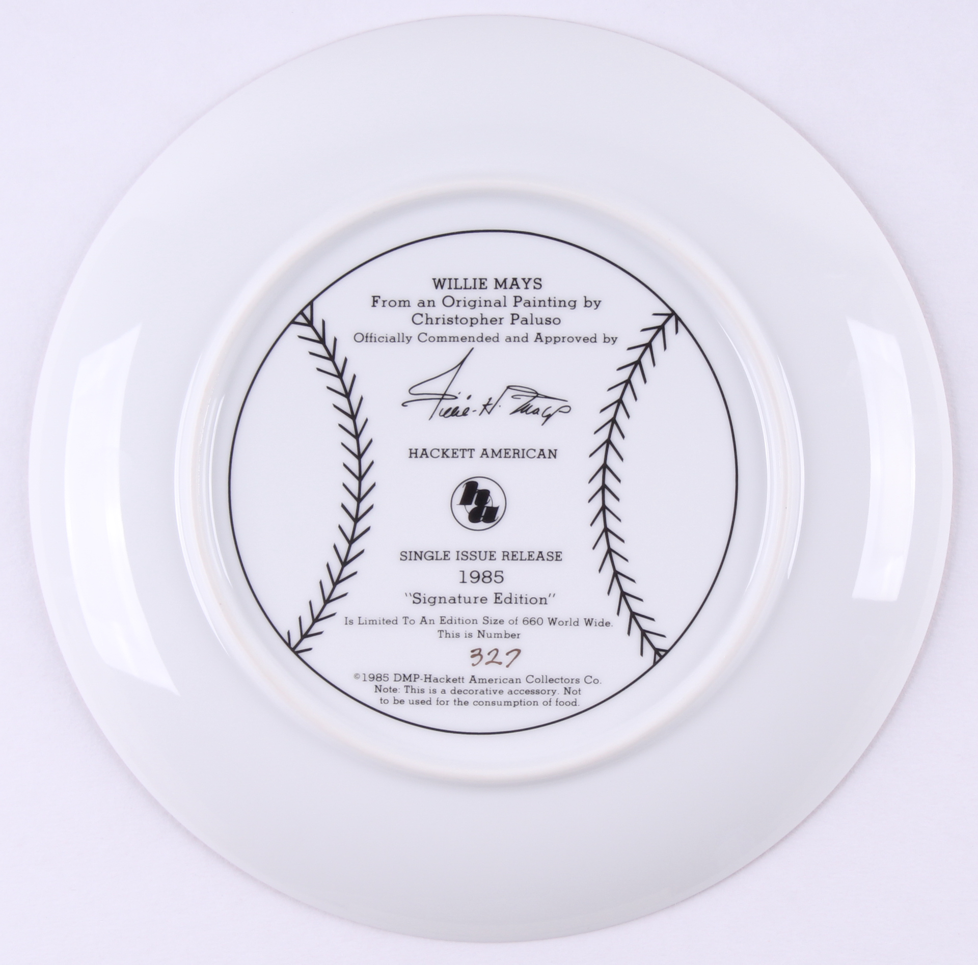 Plate measures approximately 10" in diameter. Hand-signed in gold paint pen by Willie Mays (San Francisco, HOF). The plate is a limited edition and has been hand-numbered #327/660.