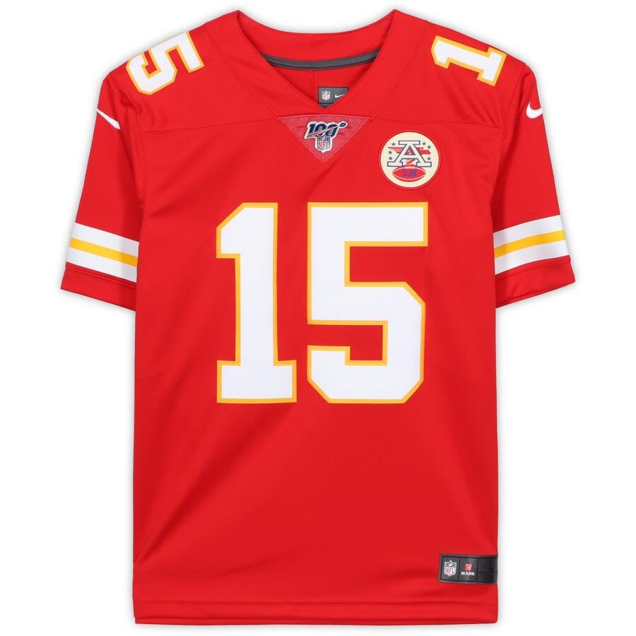 This Nike NFL 100 red limited jersey has been personally hand-signed by Patrick Mahomes. It is officially licensed by the National Football League and comes with an individually numbered, tamper-evident hologram from Fanatics Authentic. To ensure authenticity, the hologram can be reviewed online. This process helps to ensure that the product purchased is authentic and eliminates any possibility of duplication or fraud.