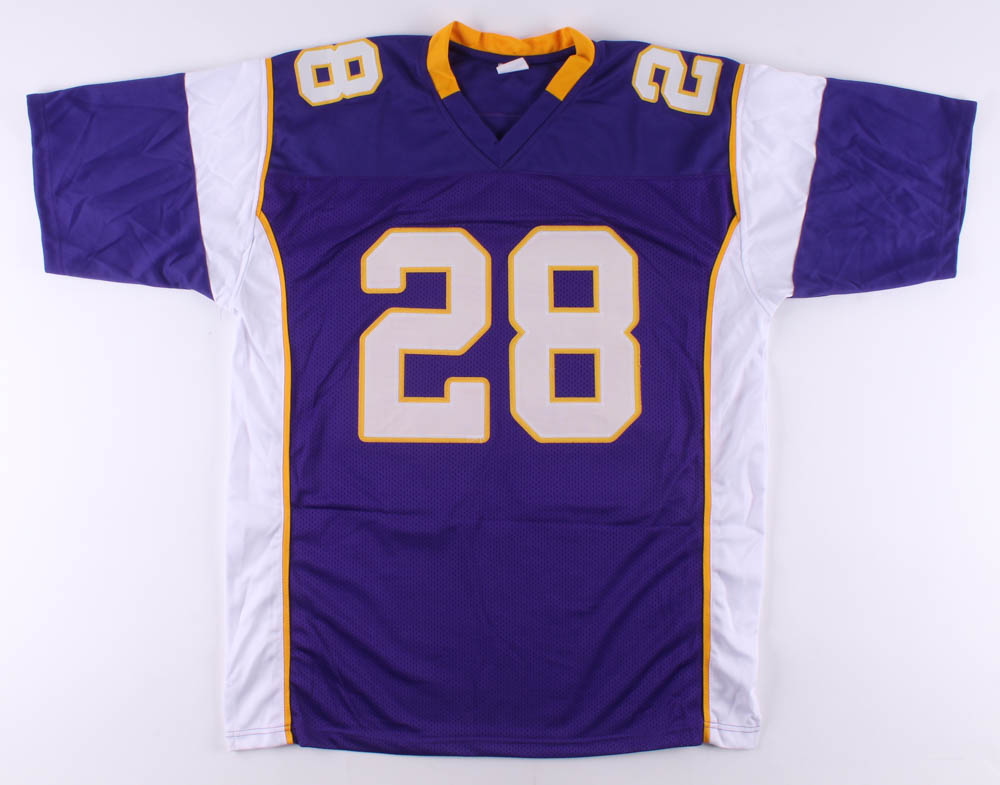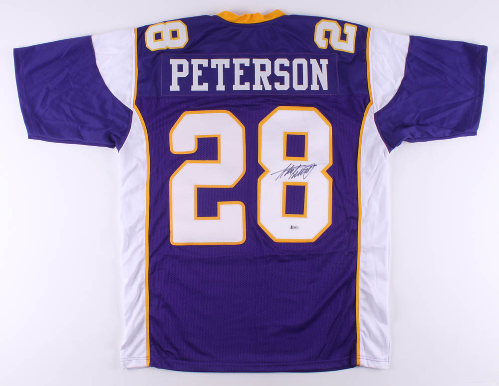 Custom on-field style jersey. Everything is sewn on, size XL. Hand-signed in black felt-tip by Adrian Peterson.