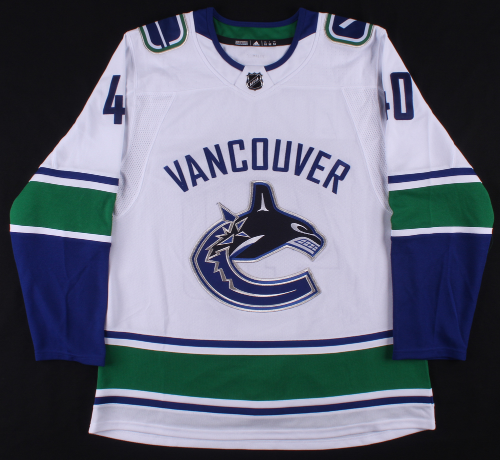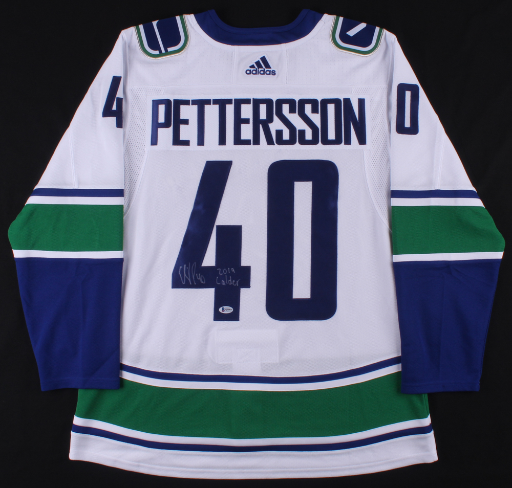 Adidas on-ice style jersey. Everything sewn on, size 52. Hand signed in silver paint pen by Elias Pettersson.