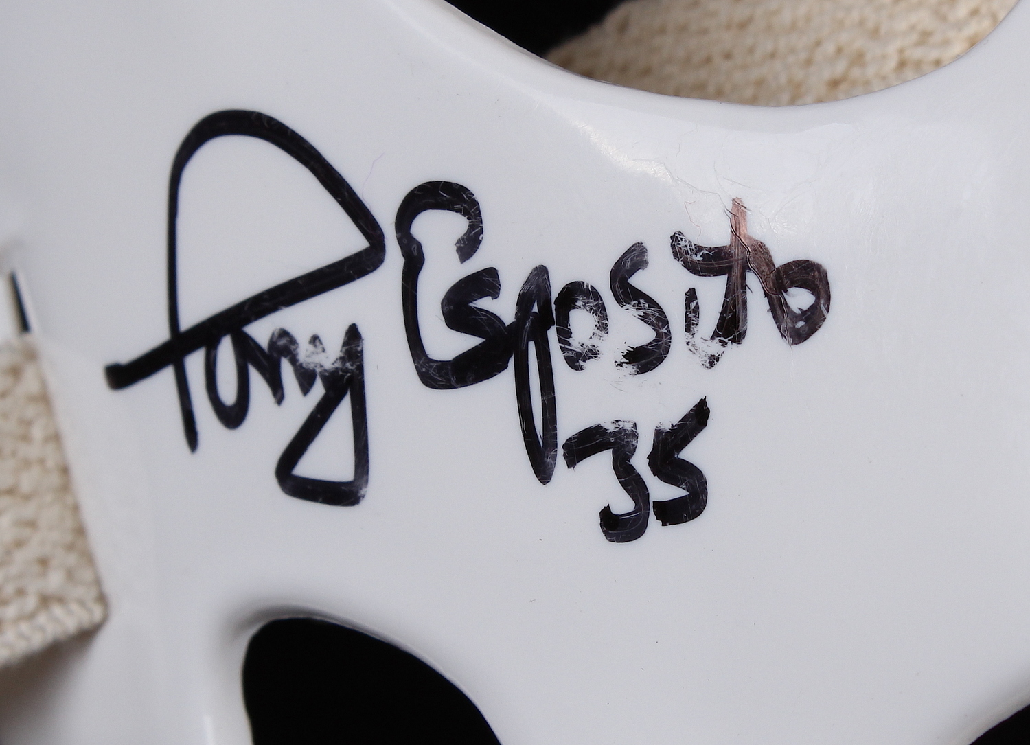 Full-size throwback hockey mask signed in black felt-tip pen by Tony Esposito (Blackhawks HOF). Please note, the mask has a smudge in the autograph. See photos for more details. The autograph includes an official PSA/DNA hologram and matching COA for authenticity purposes. The signing of this item was witnessed by PSA.