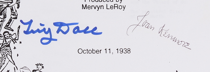 Script has been hand-signed on the cover in blue felt-tip pen by Tiny Doll and black ink pen by Joan Kenmore ("Munchkins"). The autographs include an official James Spence Authentication (JSA) hologram and matching COA for authenticity purposes.