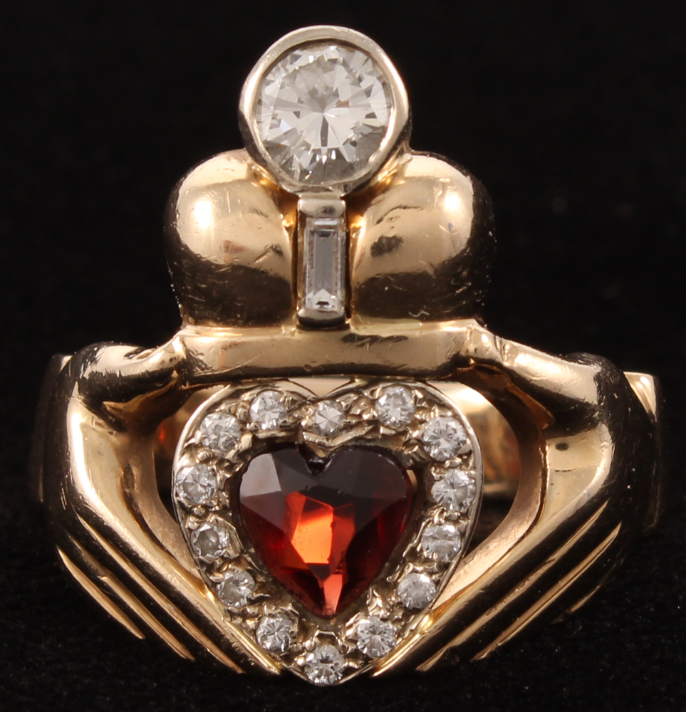 14kt Yellow Gold Garnet & Diamond Claddagh Ring