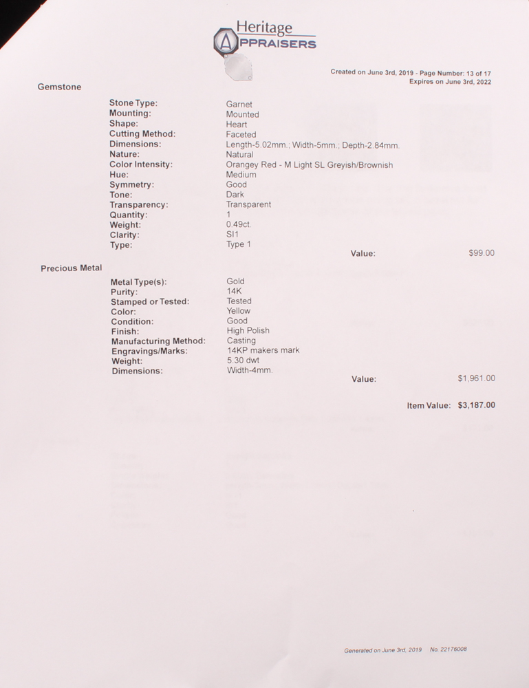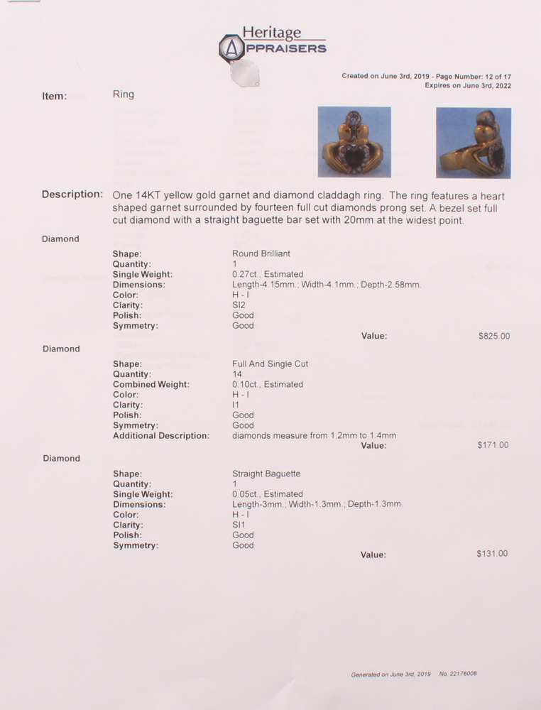 14kt Yellow Gold Garnet & Diamond Claddagh Ring features a heart shaped garnet surrounded by (14) fourteen full cut diamonds prong set. A bezel set full cut diamond with a straight baguette bar set.