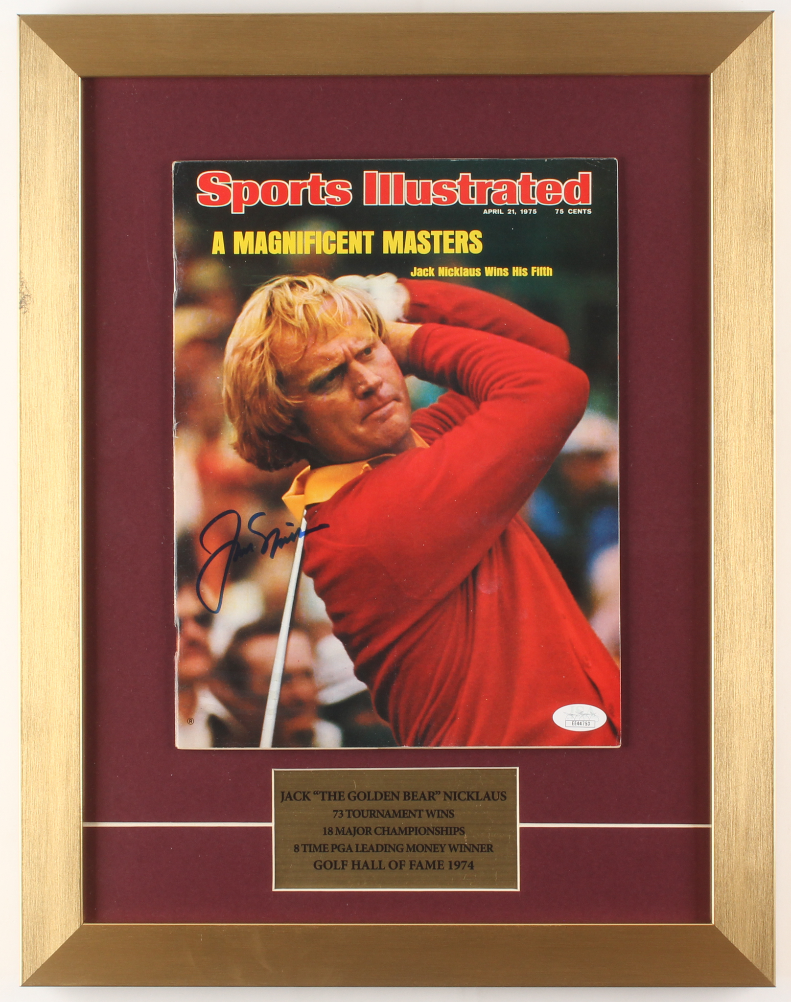 Custom frame measures 14" x 18" in size and features a 1975 "Sports Illustrated" magazine that has been hand-signed in blue felt-tip pen by Jack Nicklaus (HOF). Please see photos for more information.