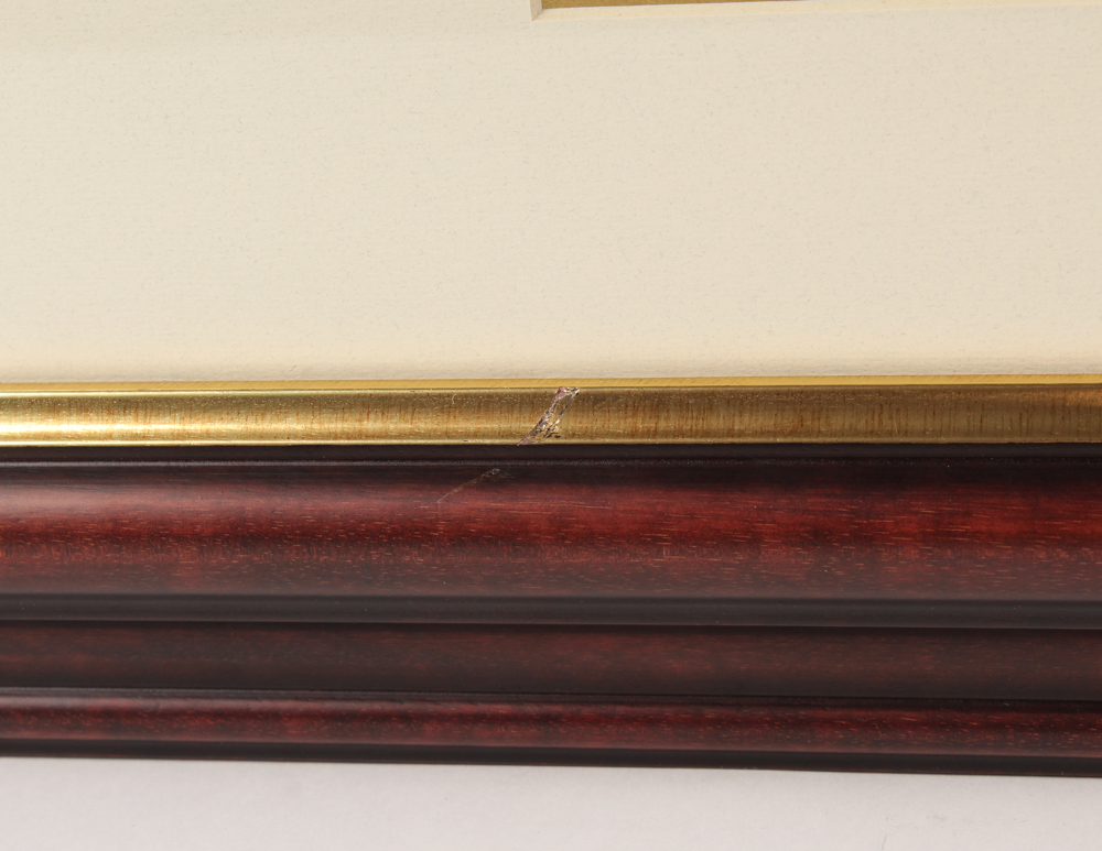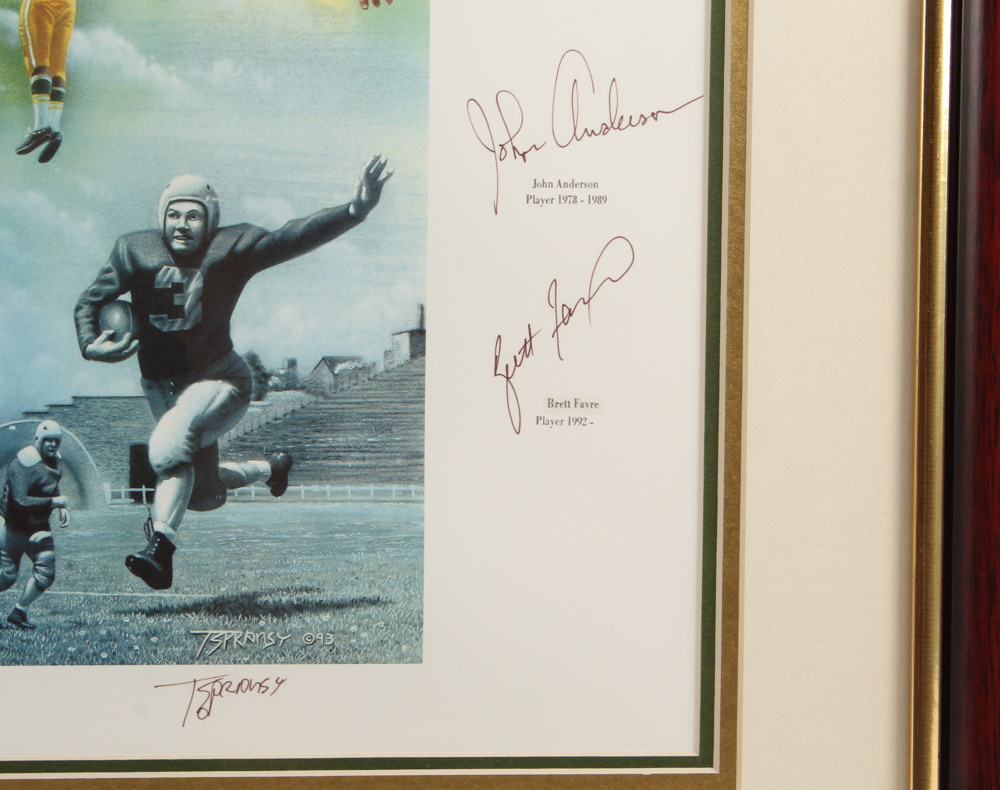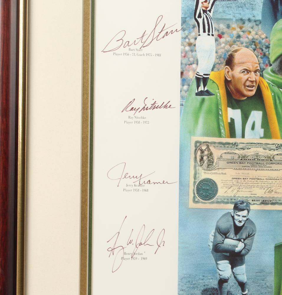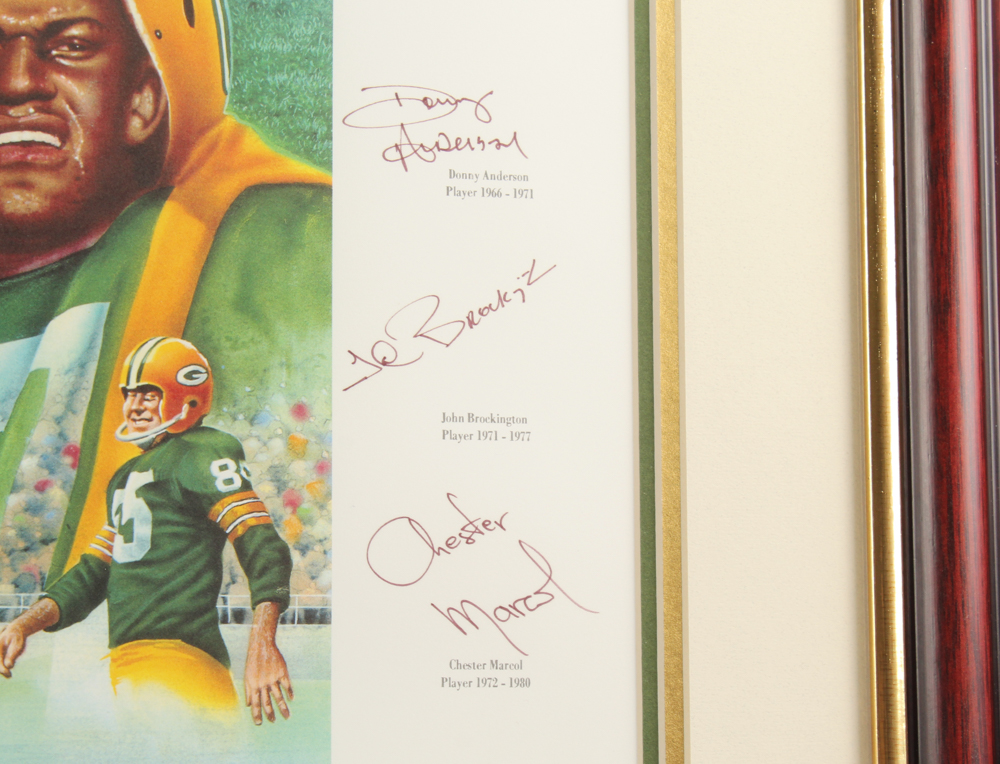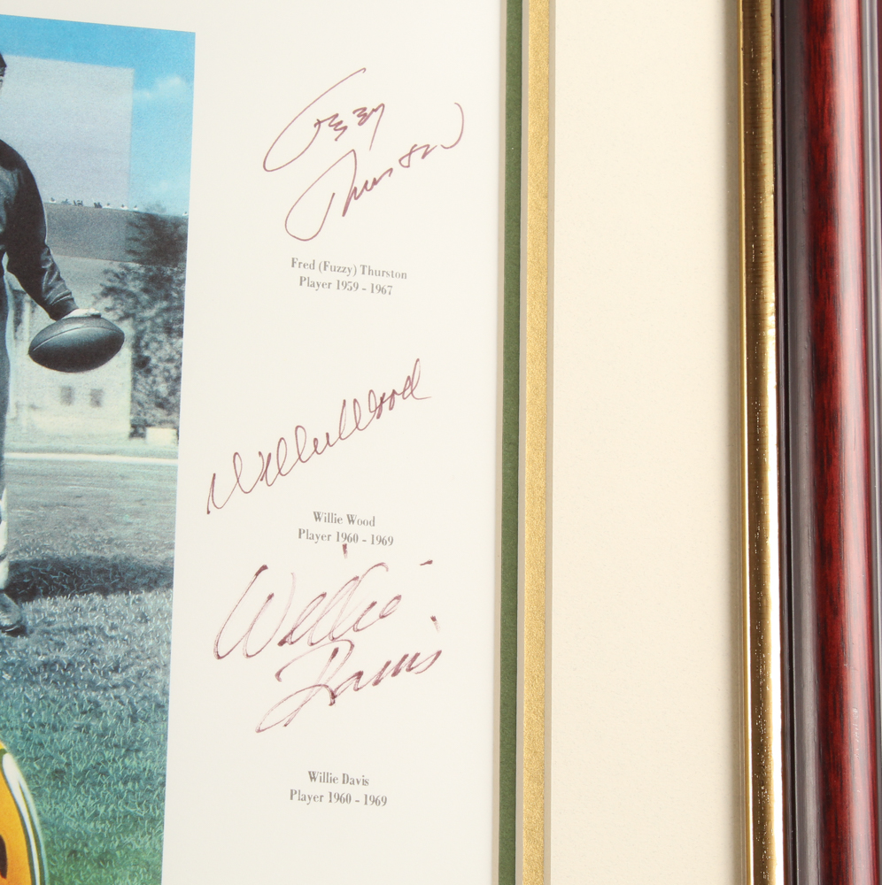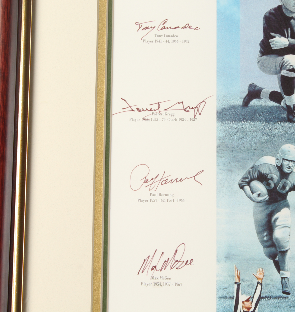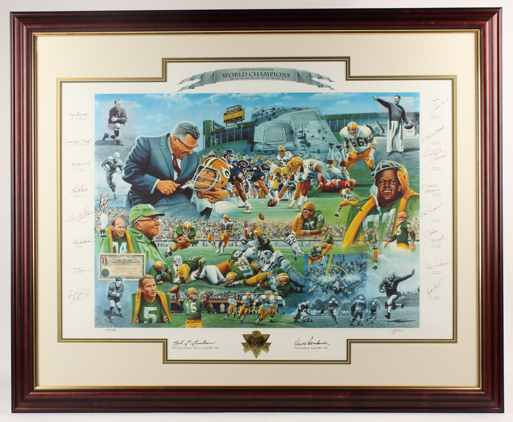 Custom framed lithograph measures approximately 36.25" x 44.25" in size. Hand-signed by (16) with Paul Hornung, Bart Starr, Jerry Kramer, Brett Favre, Forrest Gregg, Max McGee, Tony Canadeo, Ray Nitschke, Henry Jordan, Fred Thurston, Willie Wood, Willie Davis, Donny Anderson, John Brockington, Chester Marcol, and John Anderson. Please note, the signatures of Curly Lambeau and Vince Lombardi are facsimiles. Please see photos for details regarding the condition of the frame.