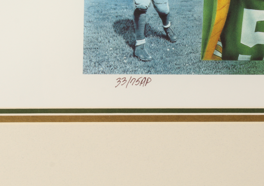 Green Bay Packers Stars 36.25x44.25 Custom Framed AP Lithograph Signed by (16) with Paul Hornung, Bart Starr, Jerry Kramer, Brett Favre, Forrest Gregg, Max McGee, Fred Thurston (JSA ALOA)