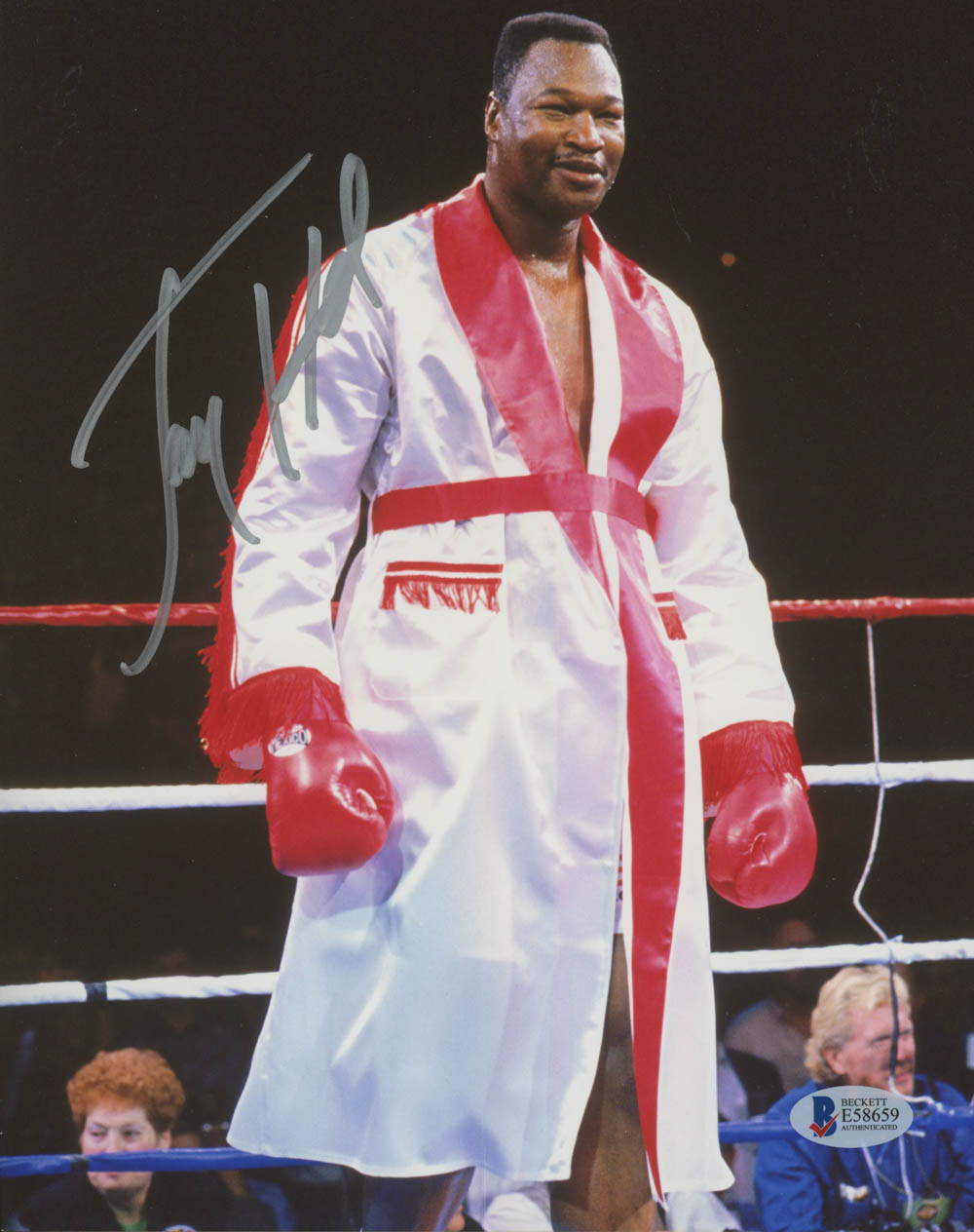Photo measures 8" x 10" in size and has been hand-signed in silver paint pen by Larry Holmes. (HOF)