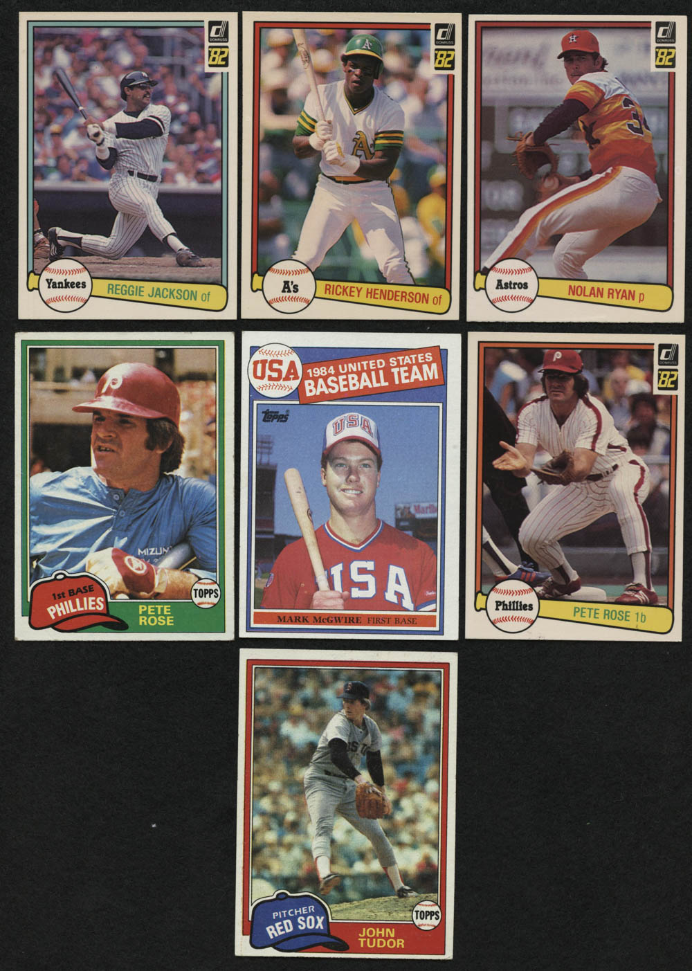Lot of (7) Baseball Cards with 1982 Donruss #535 Reggie Jackson, 1982 Donruss #419 Nolan Ryan, 1981 Topps #180 Pete Rose, 1985 Topps #401 Mark McGwire Olympic RC
