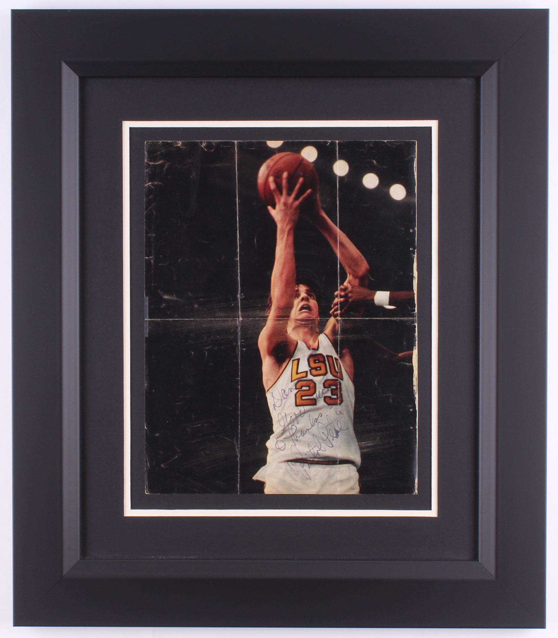"Pistol Pete" Maravich Signed Vintage LSU 16x19 Custom Framed Display Inscribed "Good Luck & Thanks" (JSA ALOA)