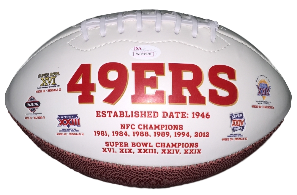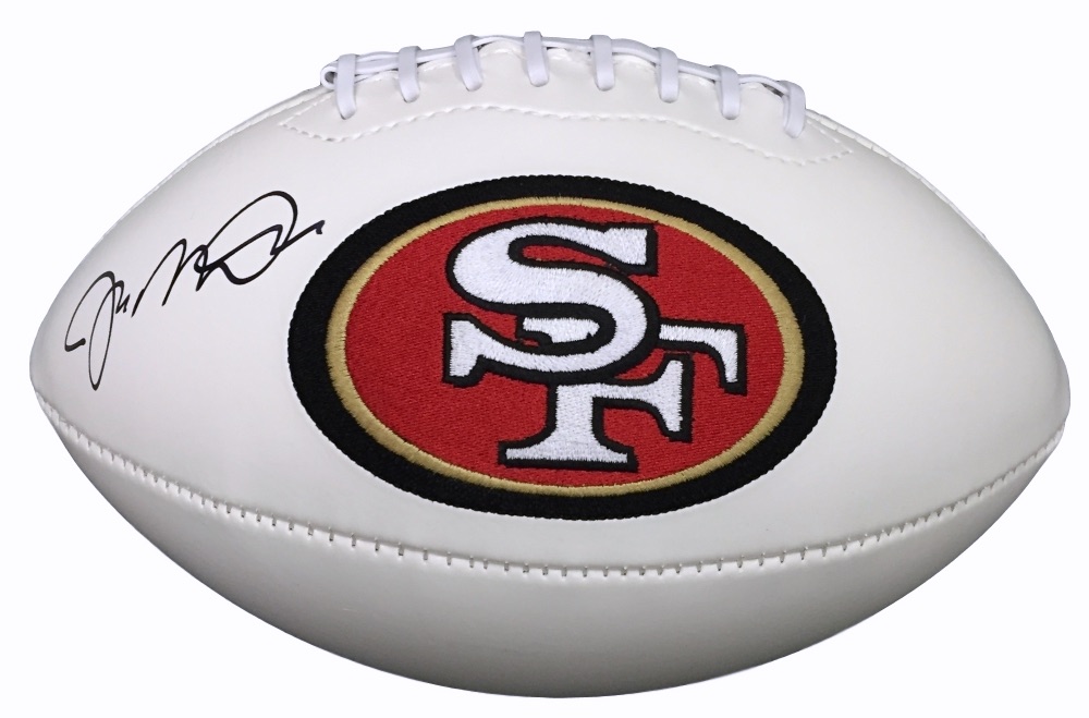 San Francisco 49ers logo football has been hand-signed in black felt-tip pen by Joe Montana (HOF).