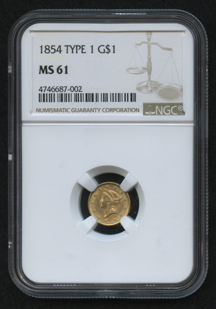 1854 $1 Liberty Head Gold Coin - Type 1 (NGC MS 61)