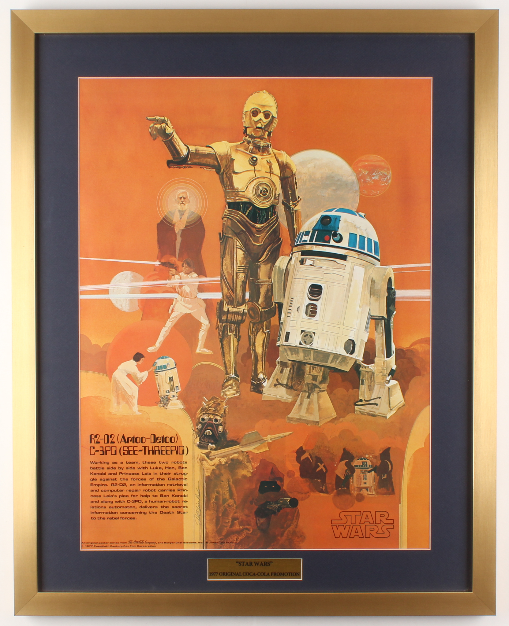 Custom frame measures 24" x 30" in size and features a vintage 1977 Coca Cola Star Wars Poster featuring R2-D2 and C3PO.