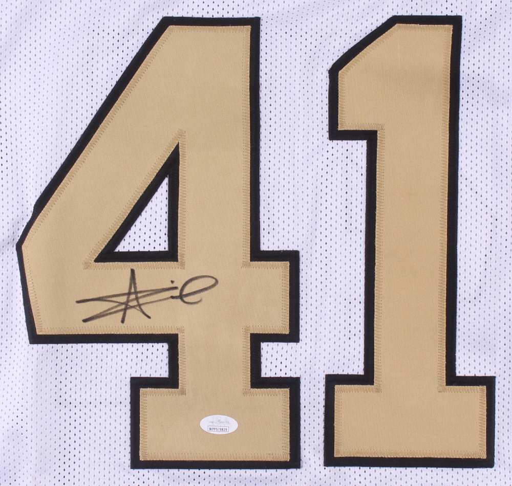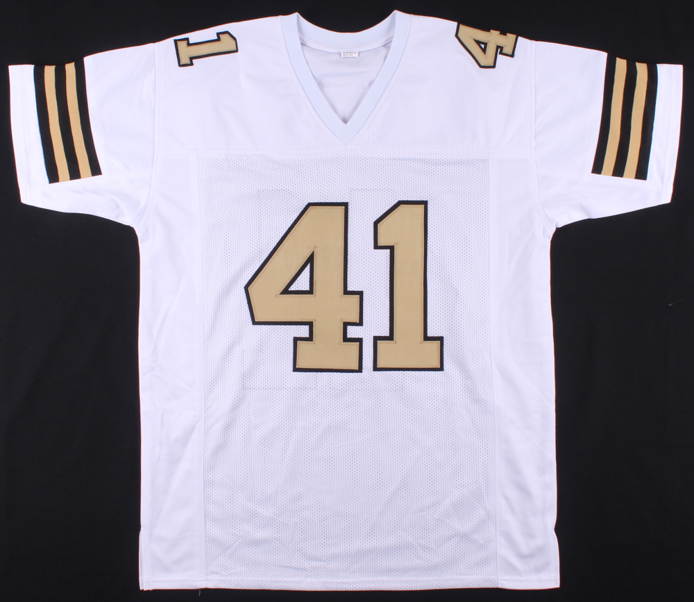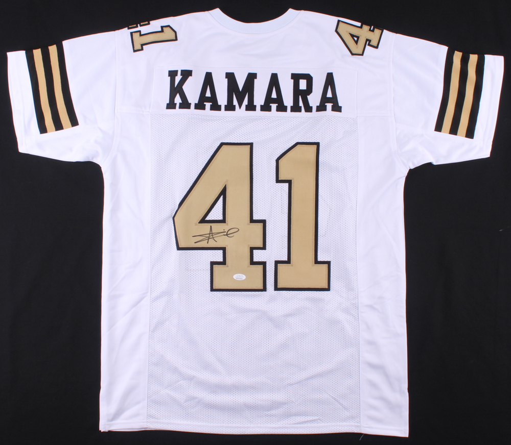 Custom on-field style jersey. Everything is sewn on, size XL. Hand-signed in black felt tip pen by Alvin Kamara.