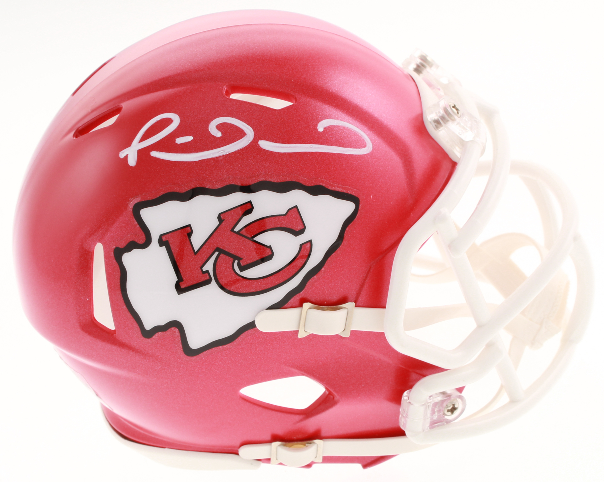 Kansas City Chiefs speed mini helmet. Hand-signed in white paint pen by Patrick Mahomes.