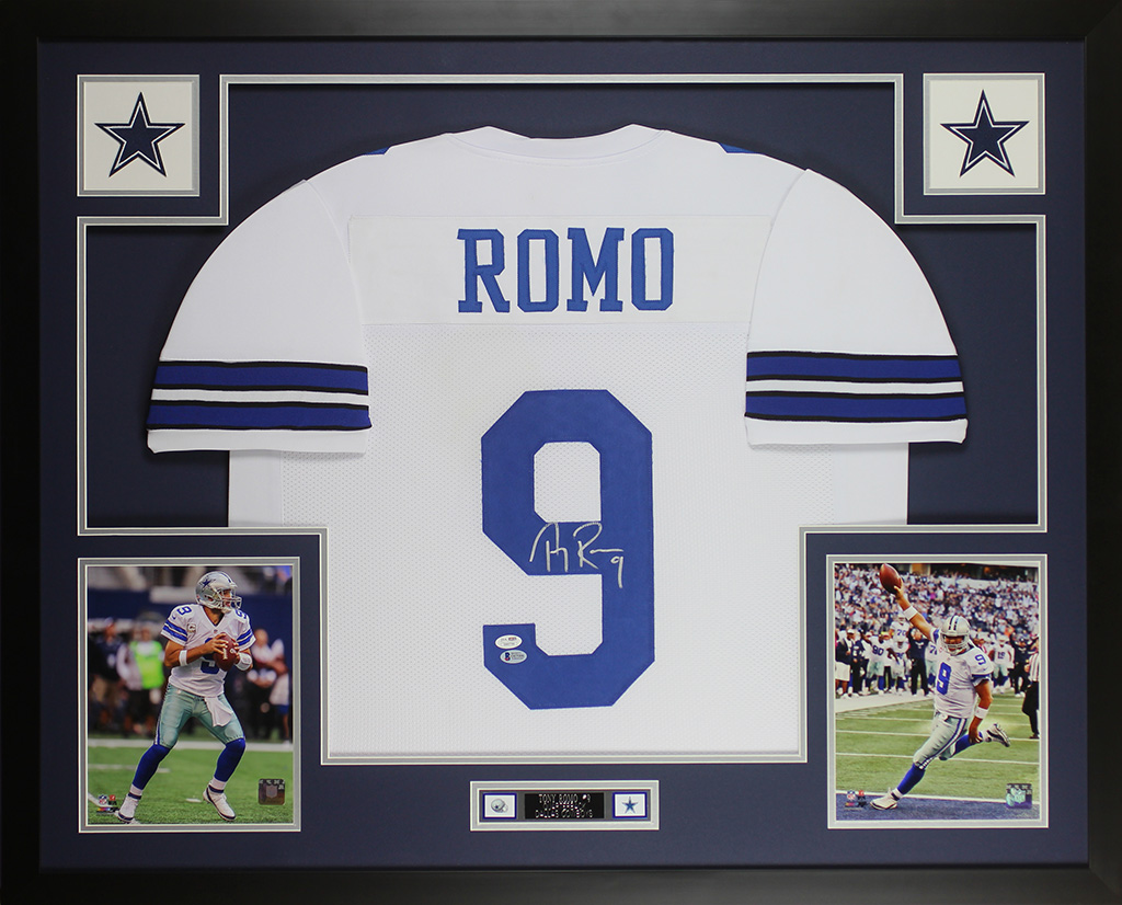 A beautifully Framed Autographed Tony Romo Dallas Cowboys Jersey. The autograph was certified by Beckett and includes a sticker on the jersey and a matching certificate attached to the back of the frame.