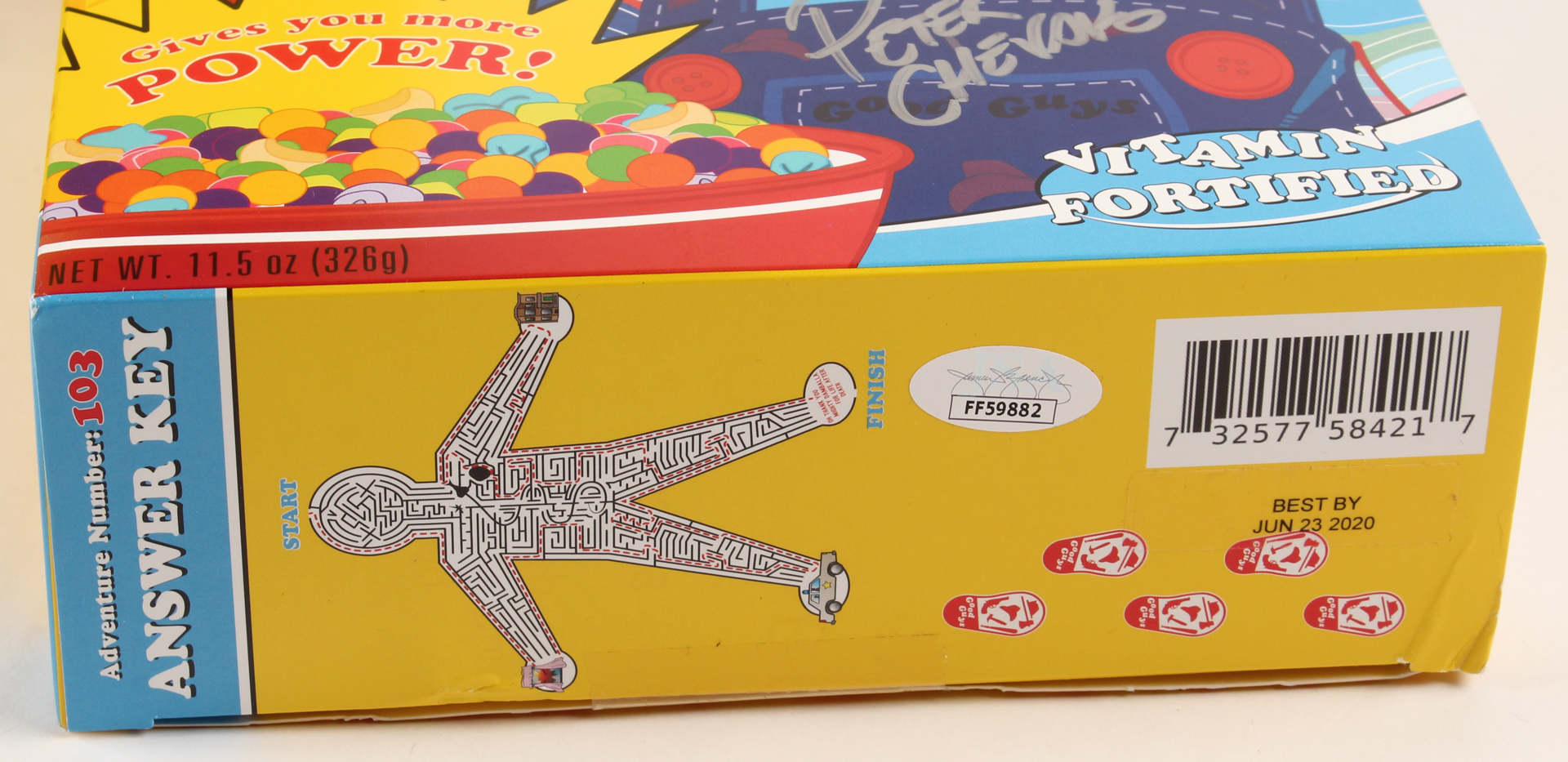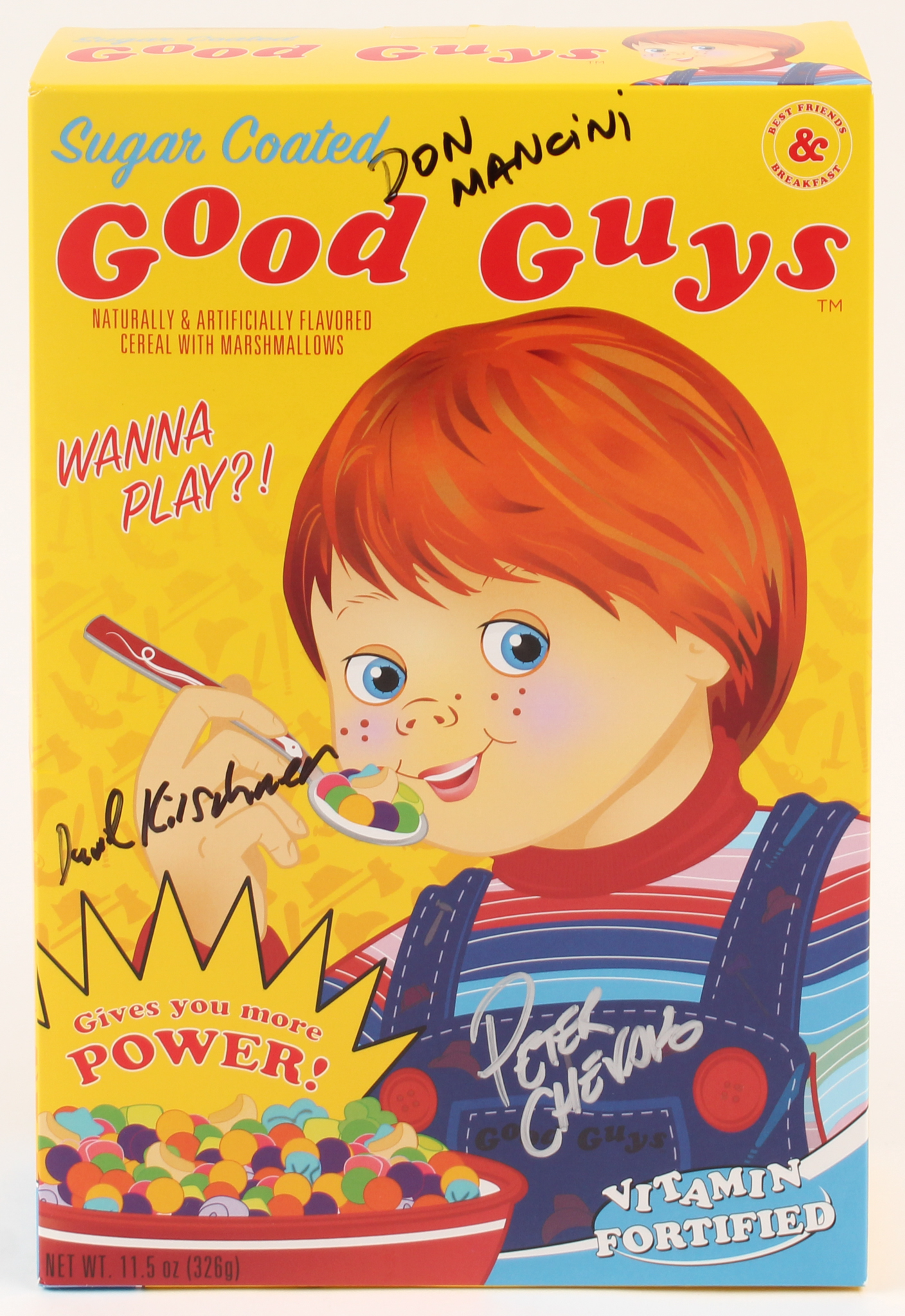 Lot includes (2) "Child's Play" Movie Items. Includes a "Good Guys" Cereal box that has been hand-signed in black and silver felt-tip pen by David Kirschner (Producer), Don Mancini (Writer), and Peter Chevako (Artist). Also included is an unsigned Chucky Doll Figurine that measures approximately 30" in height. Please note, cereal is included inside the box. Please see the photos for more details.