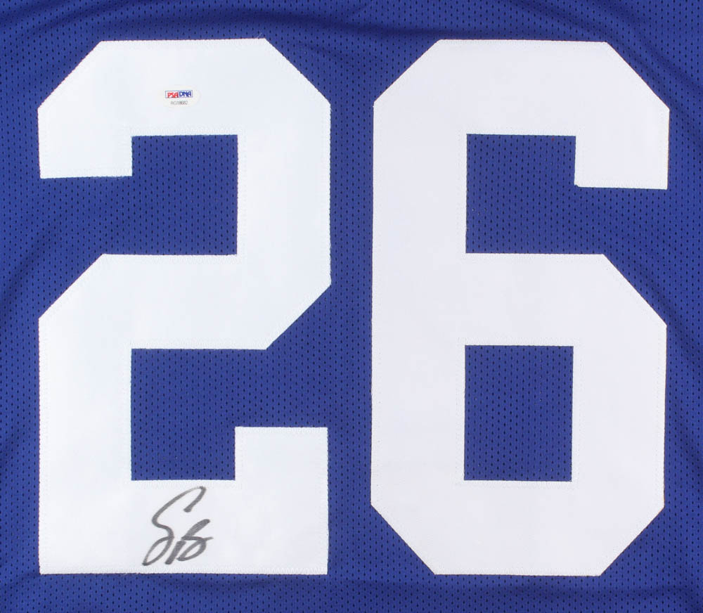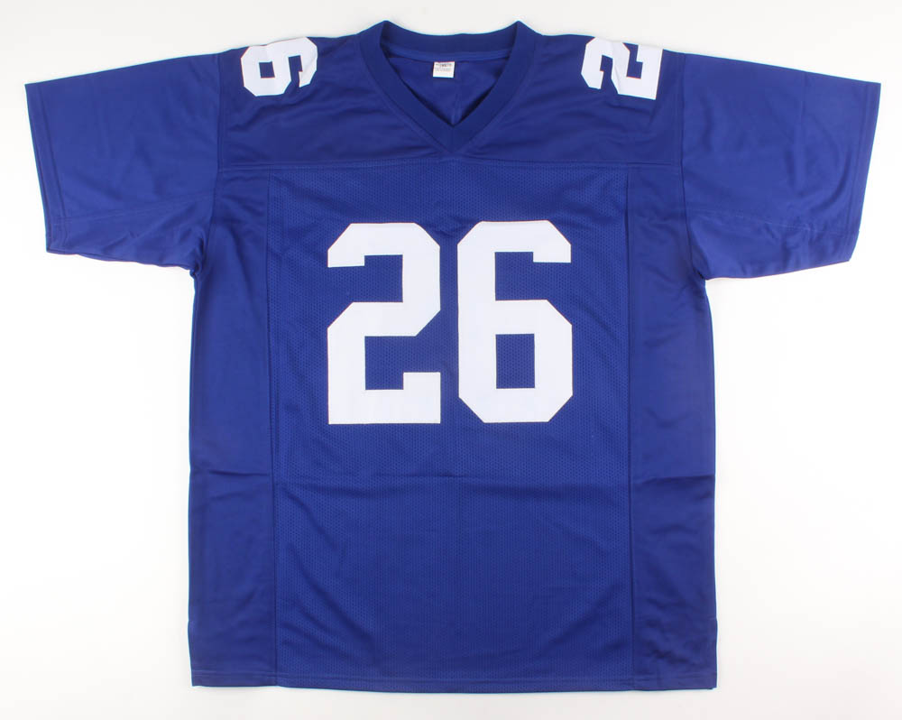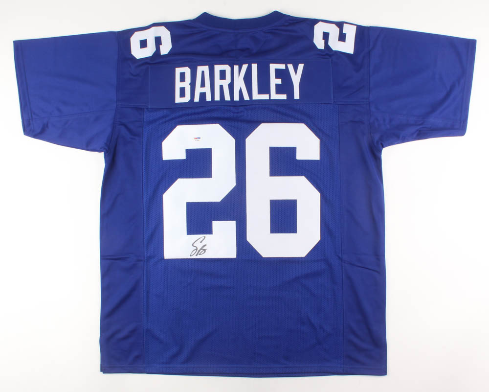 Custom on-field style jersey. Everything is sewn on, size XL. Hand-signed in black felt-tip pen by Saquon Barkley.