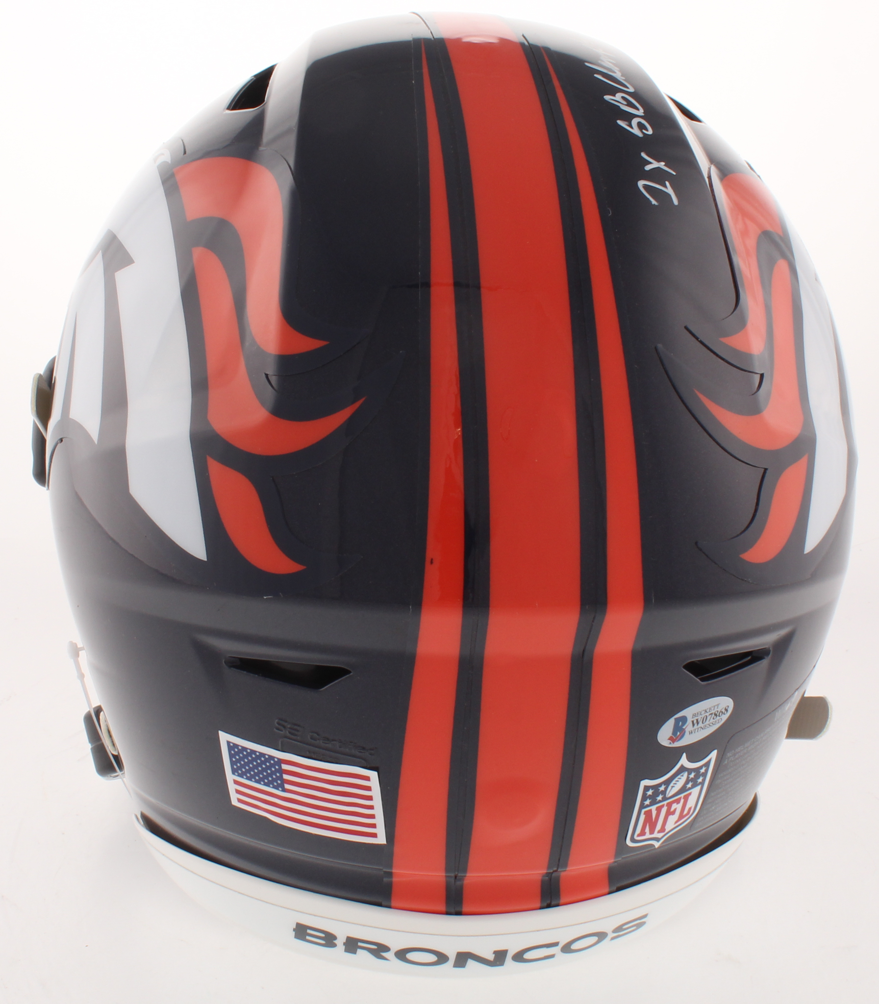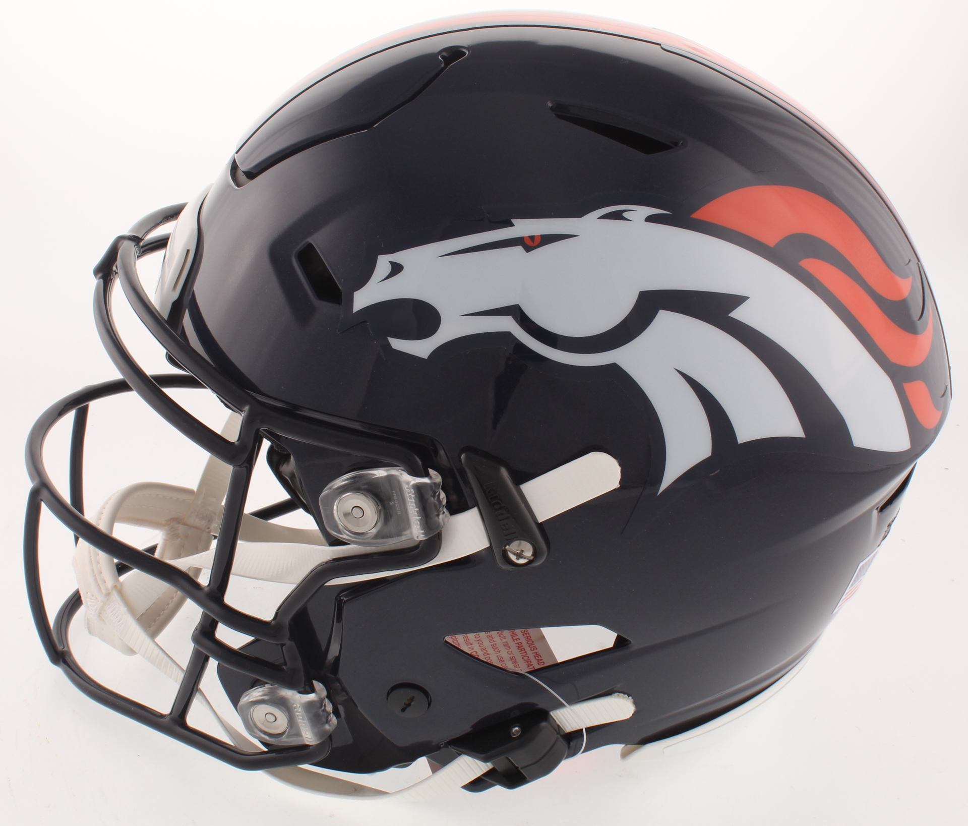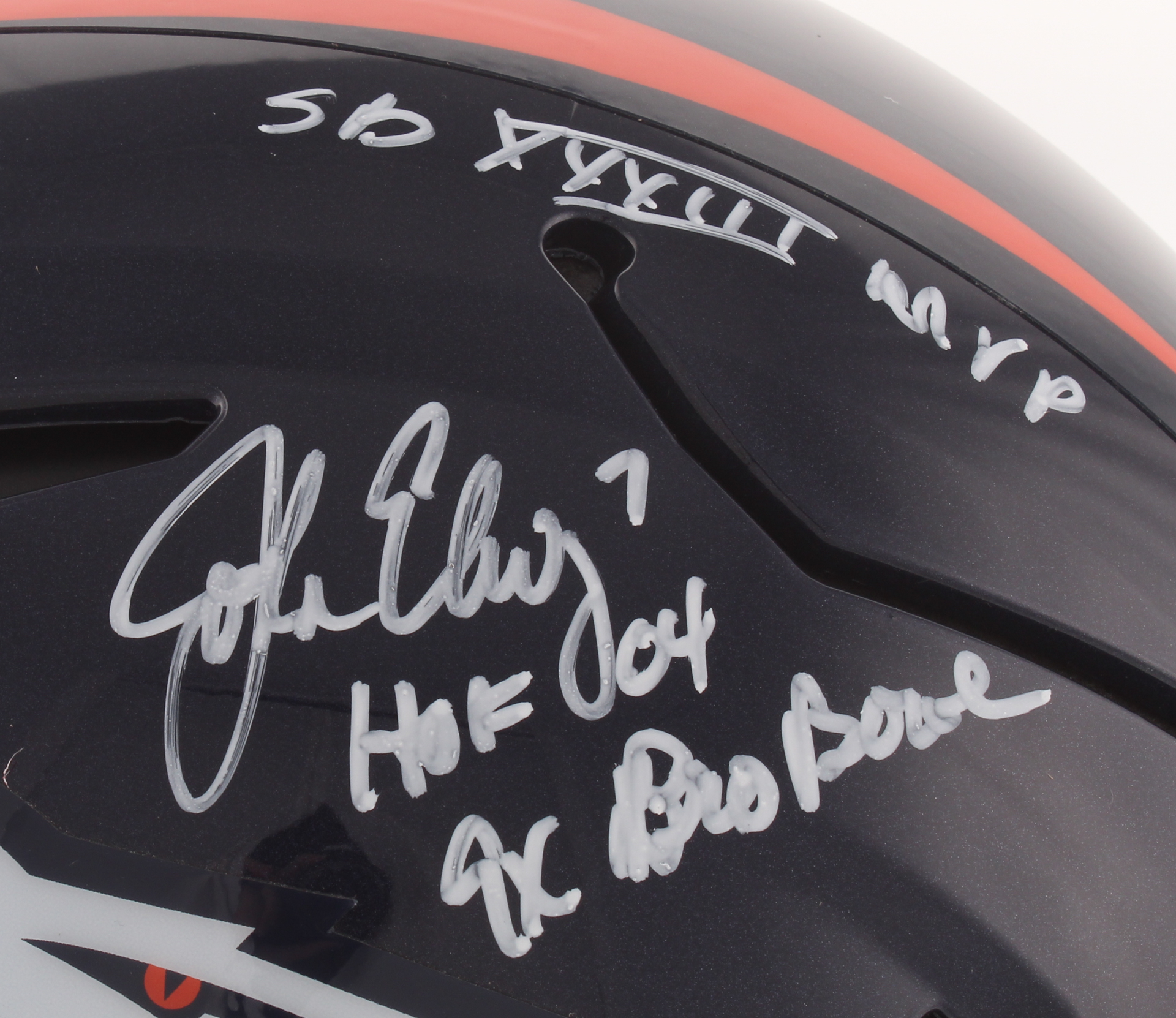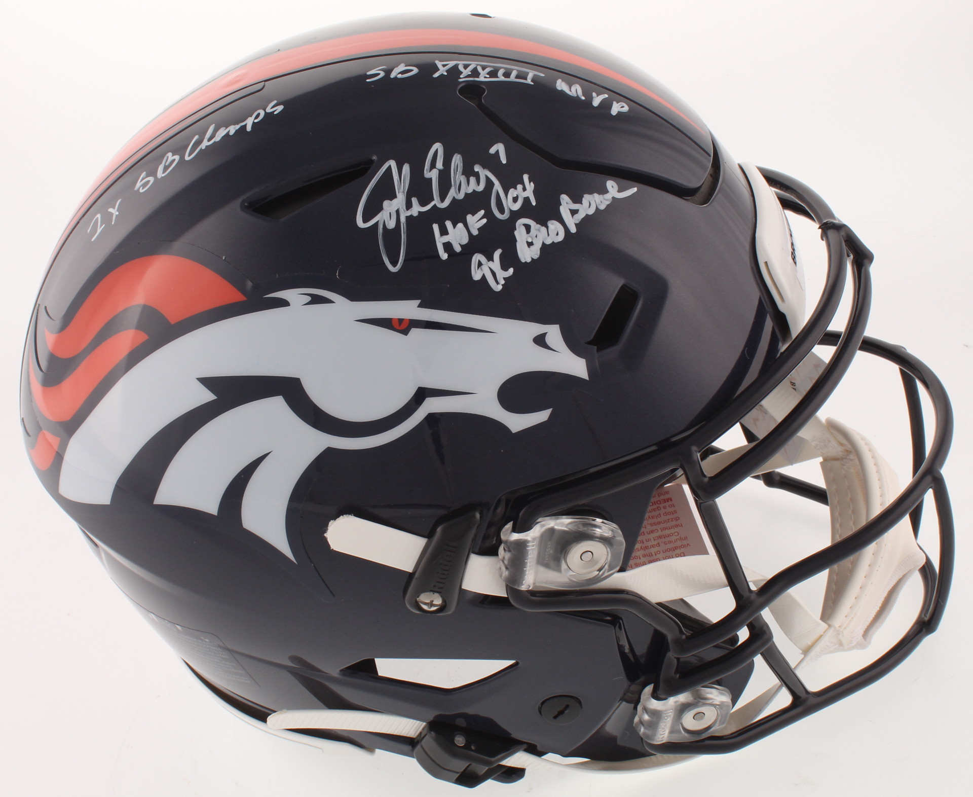 Riddell Denver Broncos full-size authentic on-field SpeedFlex helmet. Hand-signed and inscribed in white paint pen by John Elway (HOF).