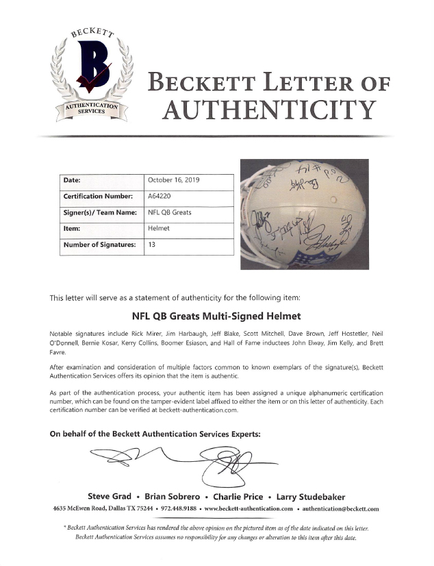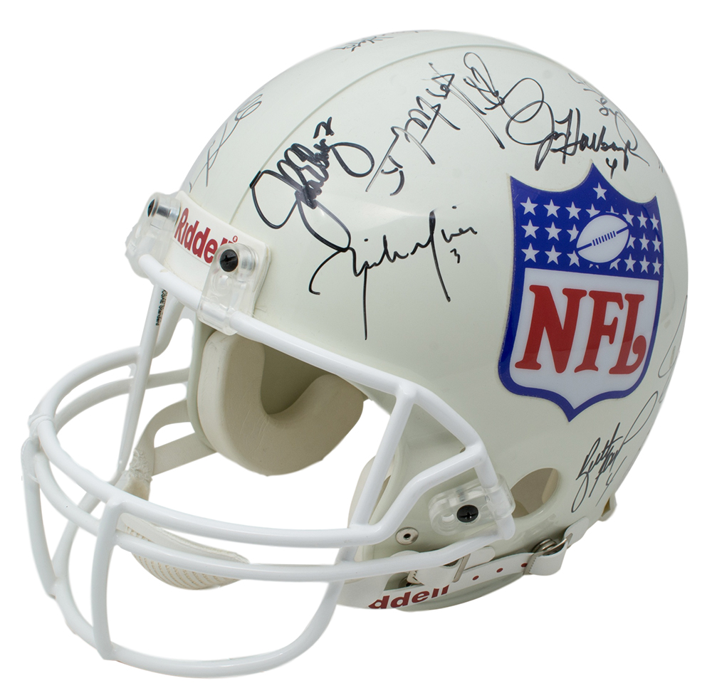 Riddell NFL Full-Size Authentic On-Field Helmet has been hand signed in black felt tip pen by (13) "Quarterback Greats" with Jim Kelly, Brett Favre, John Elway, Rick Mirer, Jim Harbaugh, Jeff Blake, Scott Mitchell, Dave Brown, Jeff Hostetler, Neil O'Donnell, Bernie Kosar, Kerry Collins, and Boomer Esiason. Please see photos for details on the condition of the helmet.