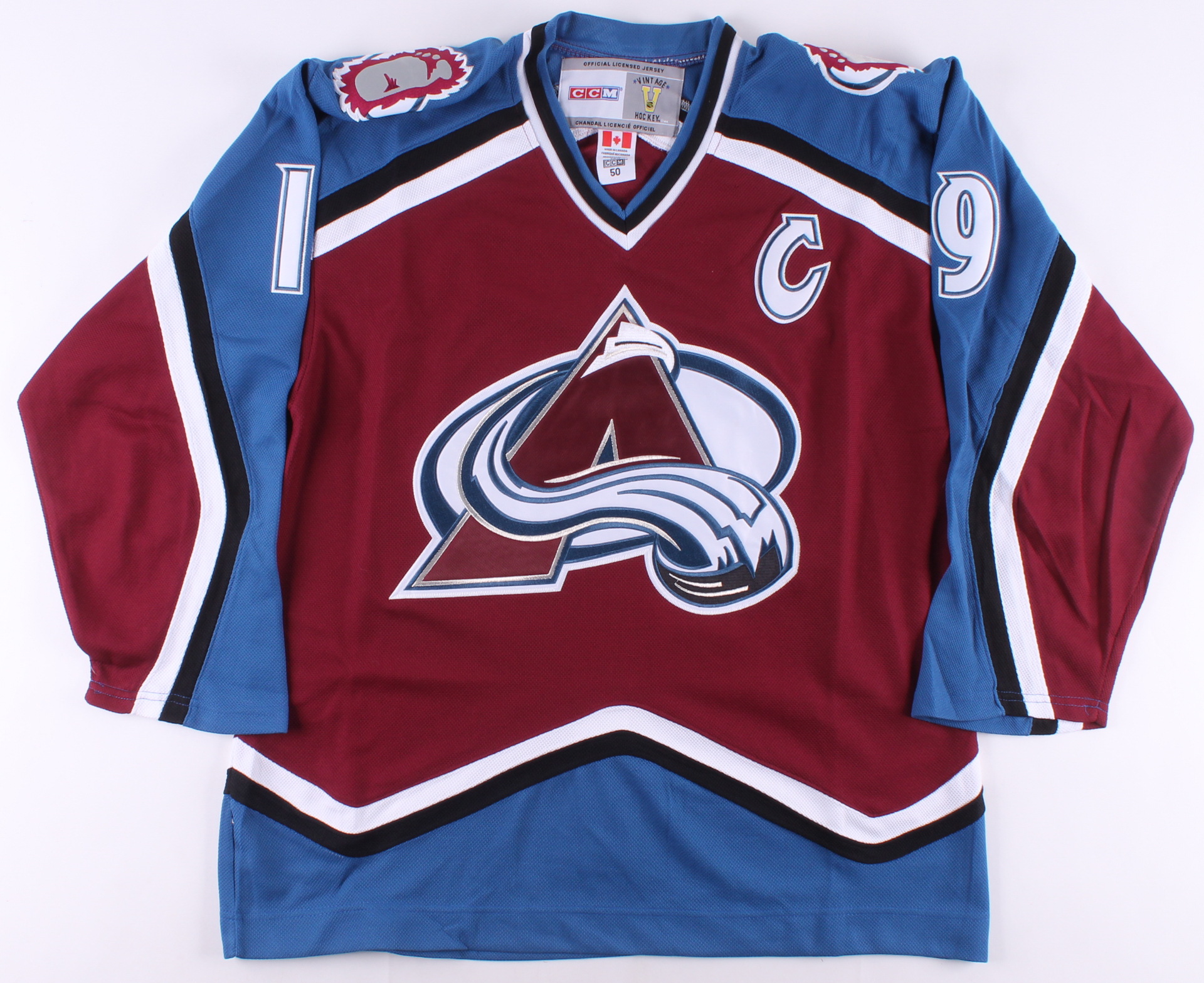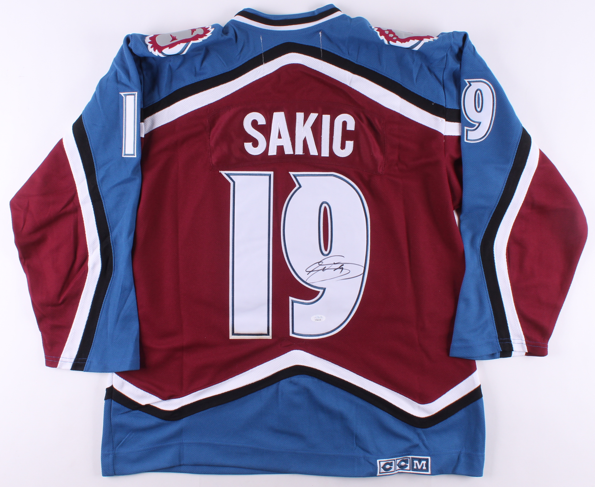 CCM on-ice style captain's jersey. Everything is sewn on, size 50. Hand-signed in black felt-tip pen by Joe Sakic (HOF).