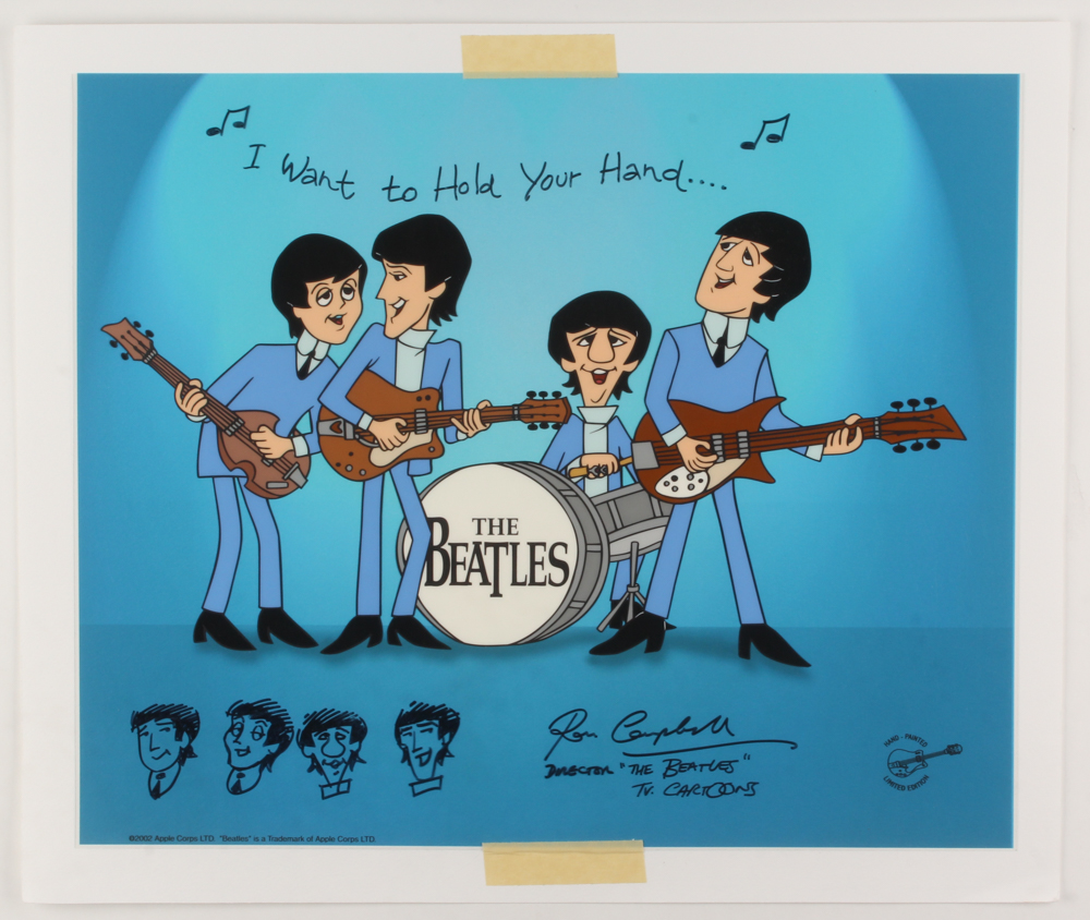 Limited edition hand-painted Cel. This hand-painted cel features Paul McCartney, George Harrison, Ringo Starr and John Lennon appear as they appeared in the animated cartoon series, Saturday Morning Beatles. Director Ron Campbell has signed the cel and drawn head caricatures of each Beatle on the cel. He has also hand written the Beatles lyrics “I want to hold your hand” on the artwork.