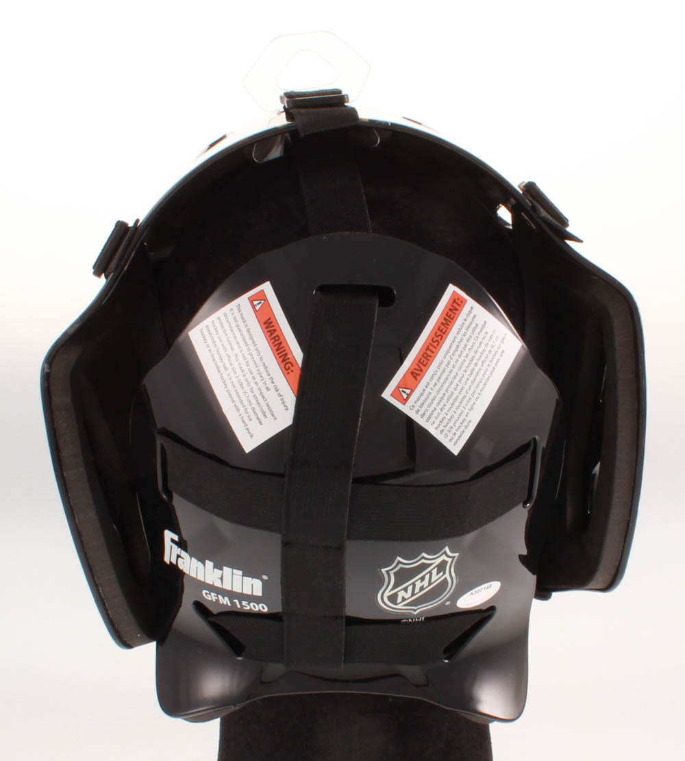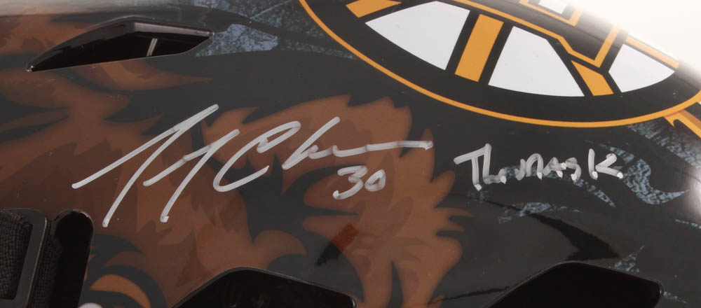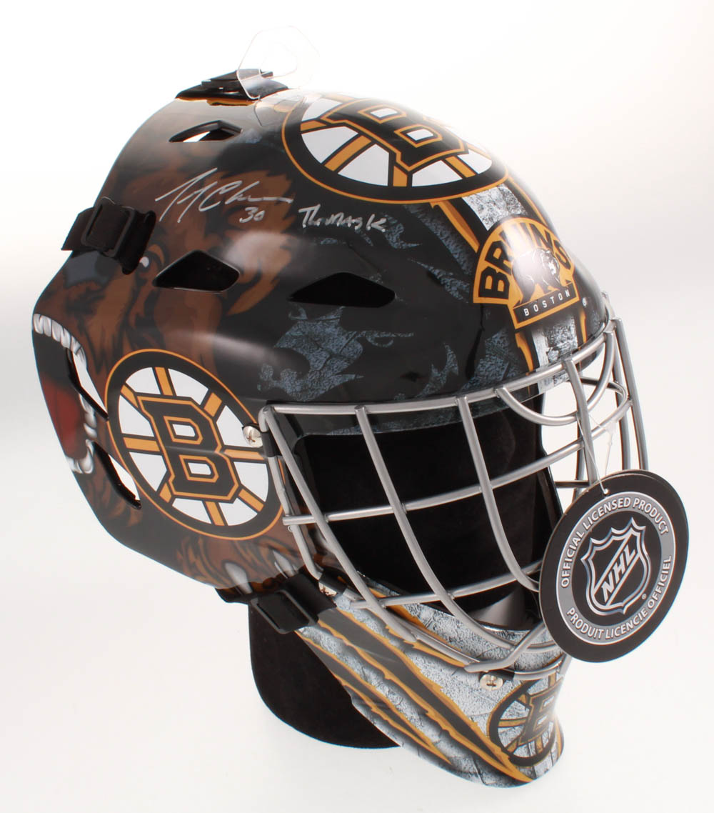 Franklin NHL Boston Bruins full-size replica hockey goalie mask. Hand-signed in silver paint pen by Gerry Cheevers (HOF).
