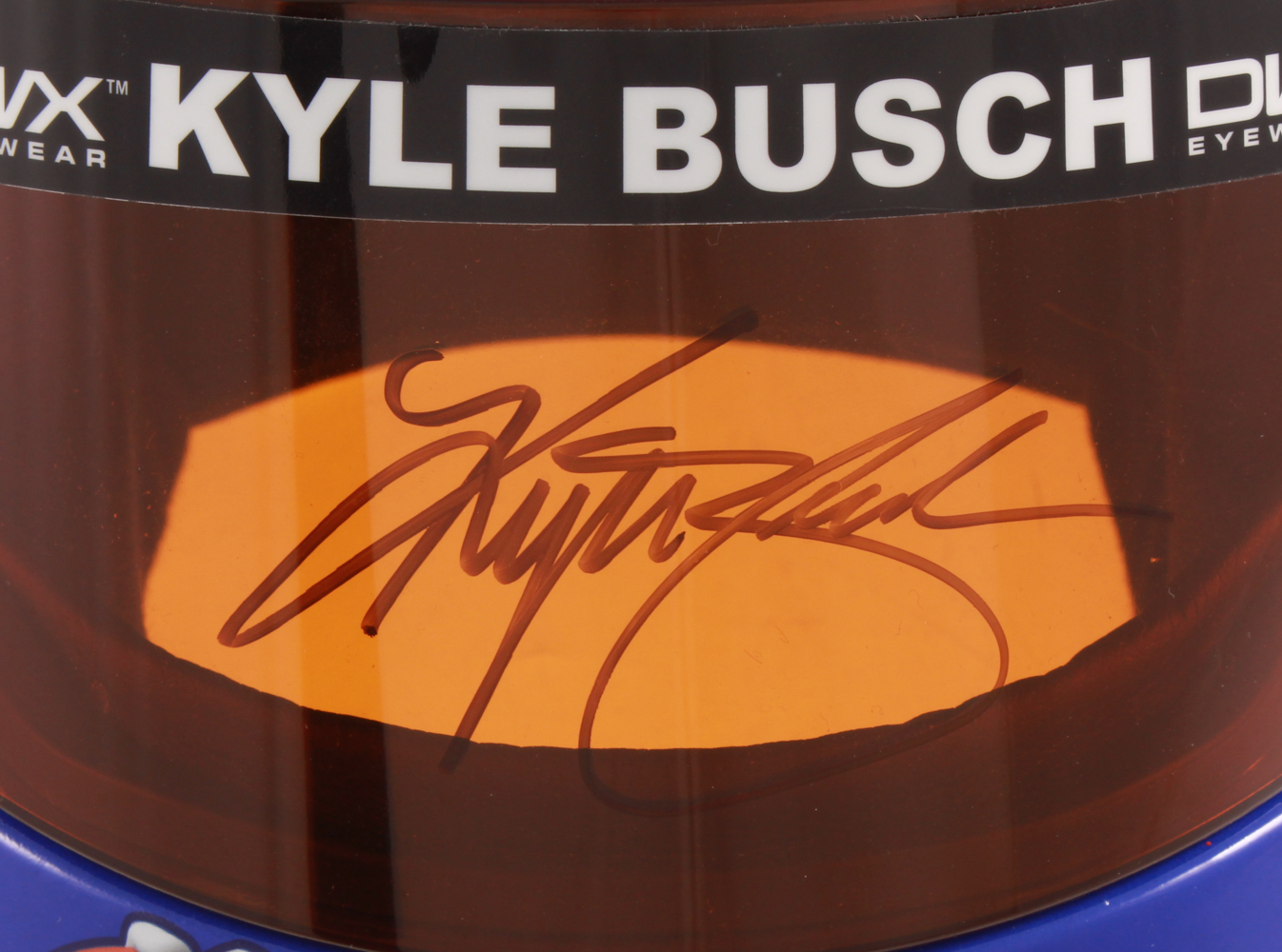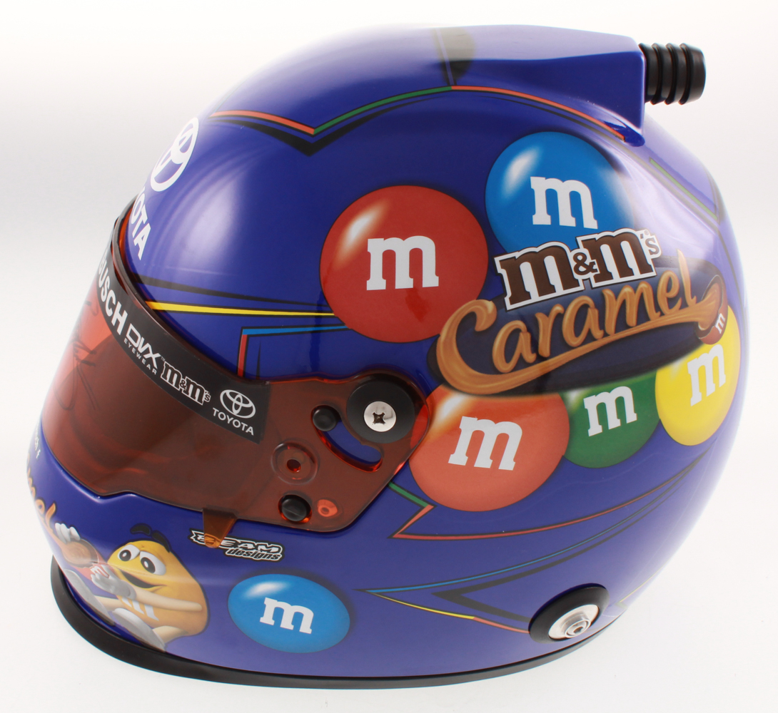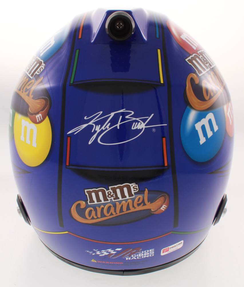 Full-size replica NASCAR helmet hand-signed on the visor in black felt-tip pen by Kyle Busch.