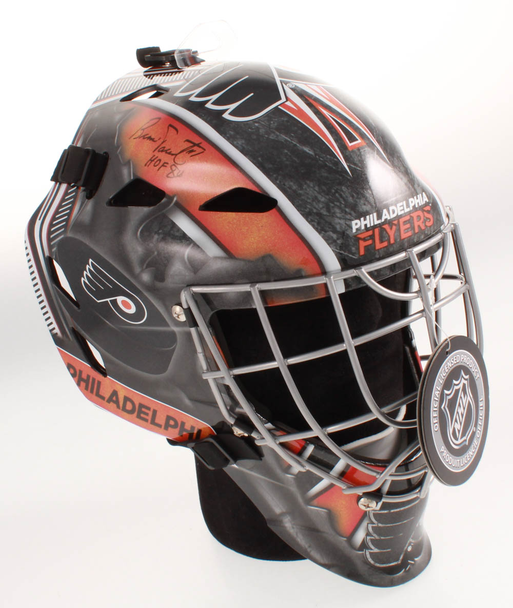 Franklin Philadelphia Flyers mini goalie mask. Hand-signed in black felt-tip pen by Bernie Parent (HOF).
