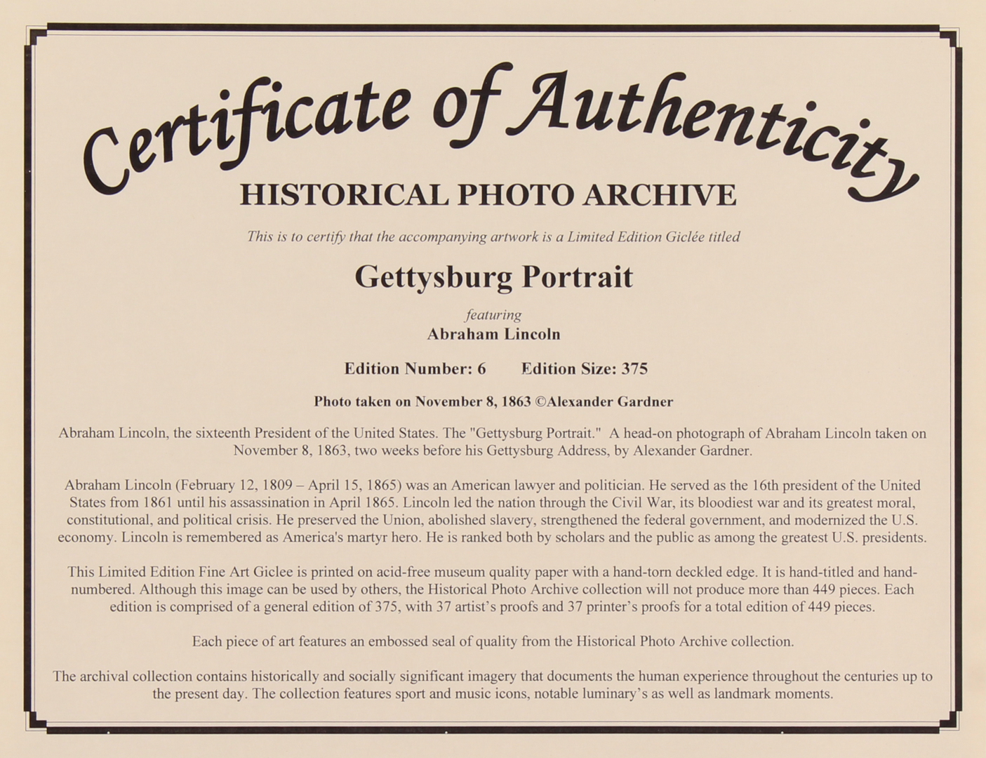 Historical Photo Archive - Abraham Lincoln "Gettysburg Portrait" Limited Edition 16x22.5 Fine Art Giclee on Paper #/375 (PA LOA)