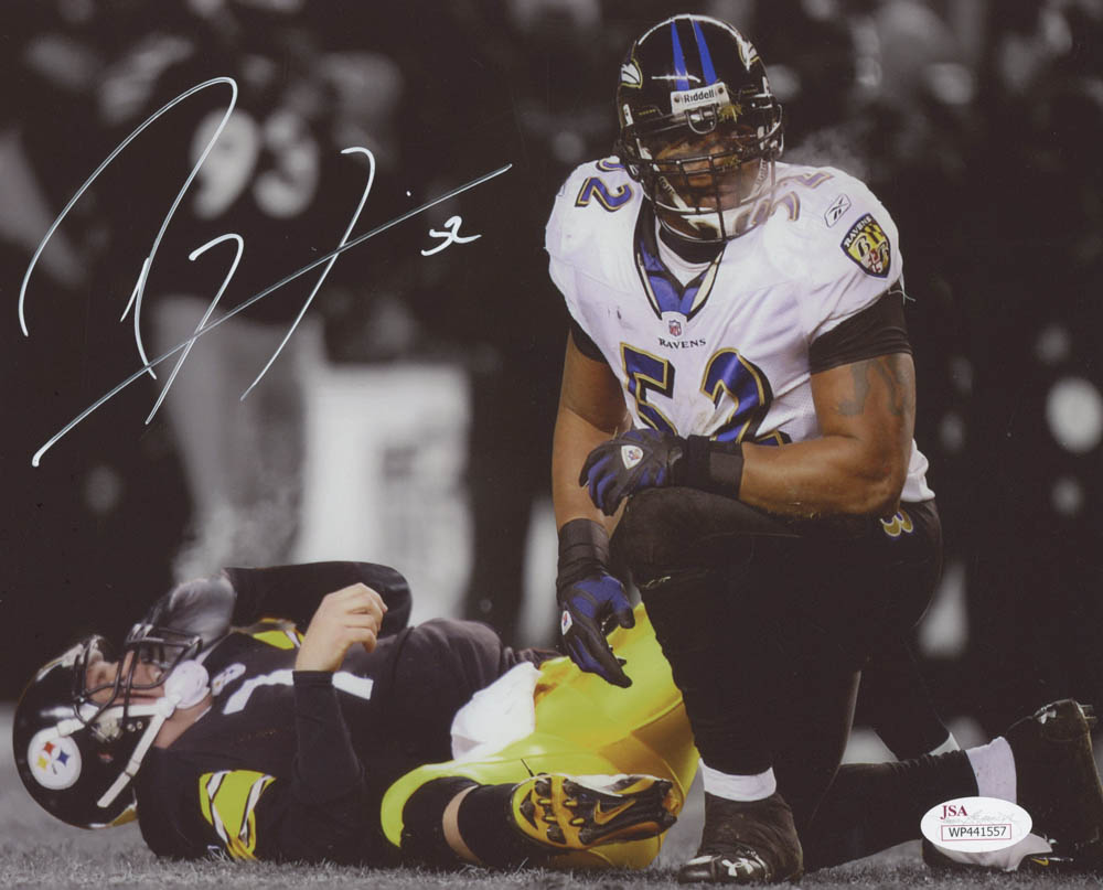 Photo measures 8" x 10" in size has been hand-signed in white paint pen by Ray Lewis (HOF).