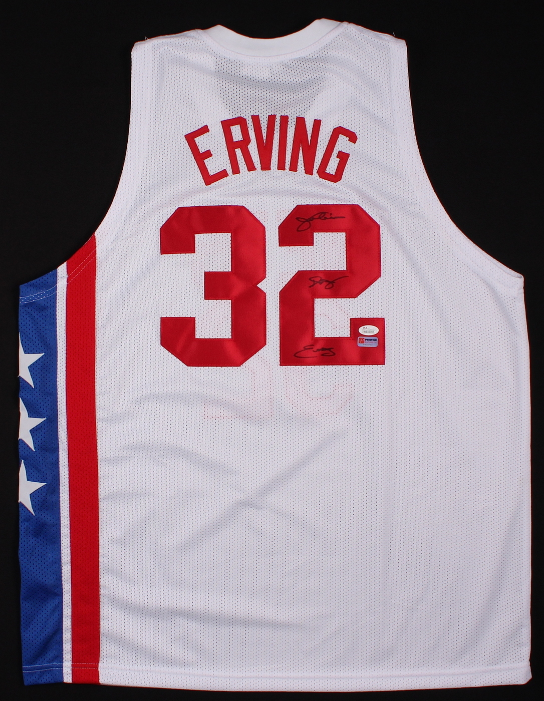 Custom on-court style jersey. Everything sewn on, size XL. Hand-signed in black felt tip pen by Julius Erving (Nets, 76ers, HOF). Signed Julius "Dr J" Erving. The autograph includes an official James Spence Authentication (JSA) hologram and matching COA for authenticity purposes. Also includes a hologram and COA from Pristine Authentic.