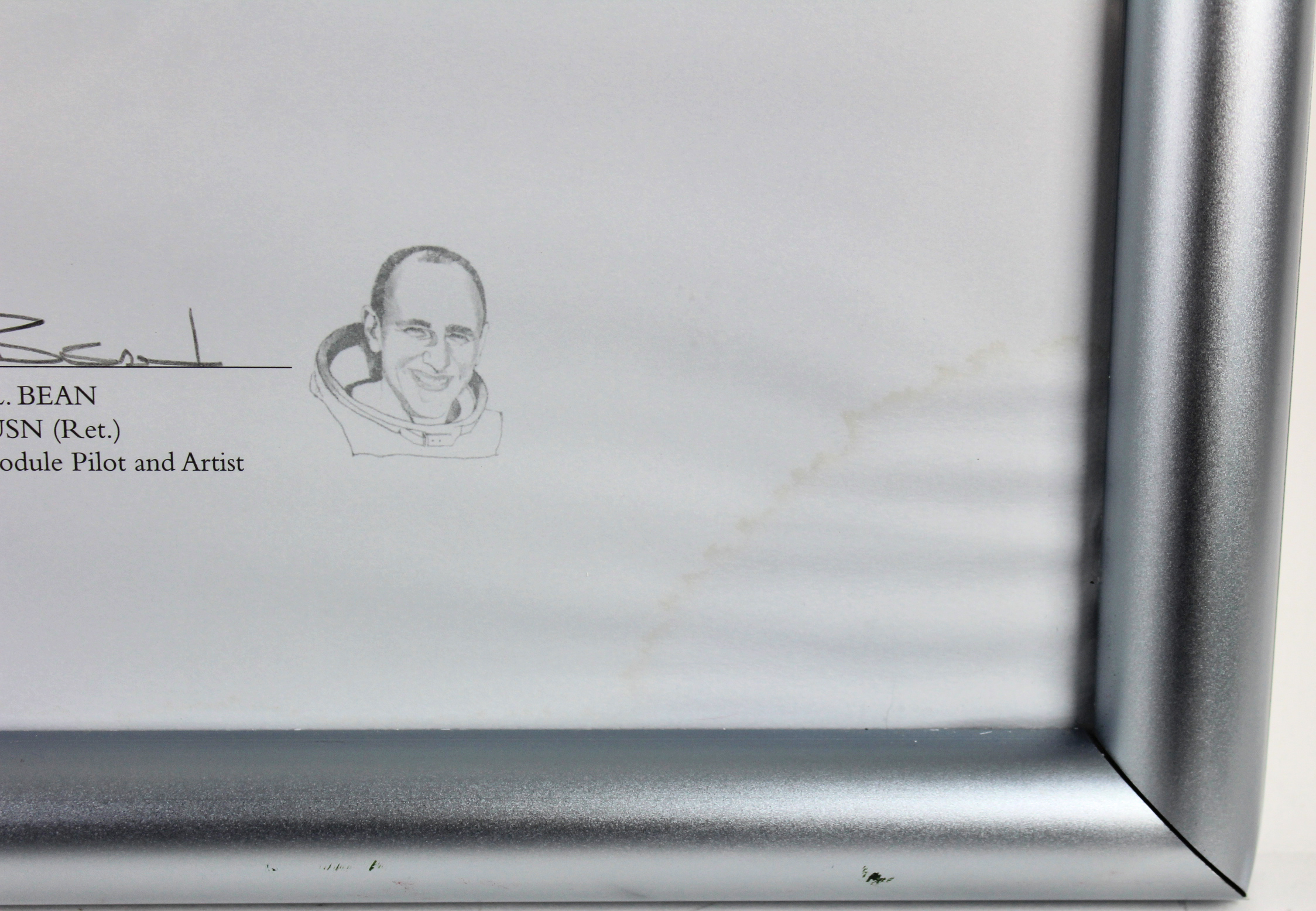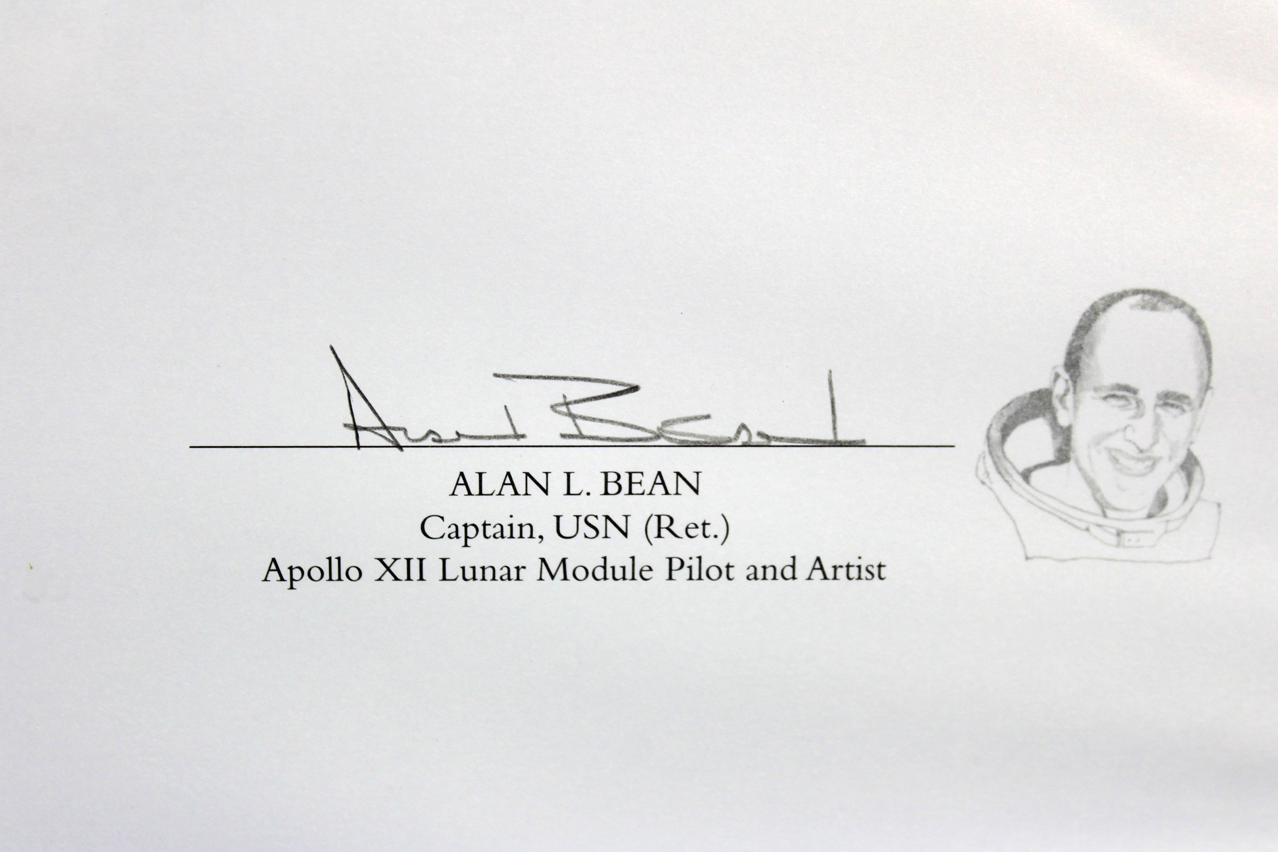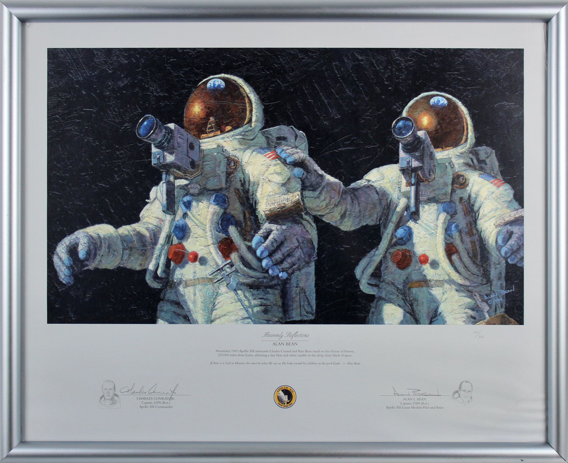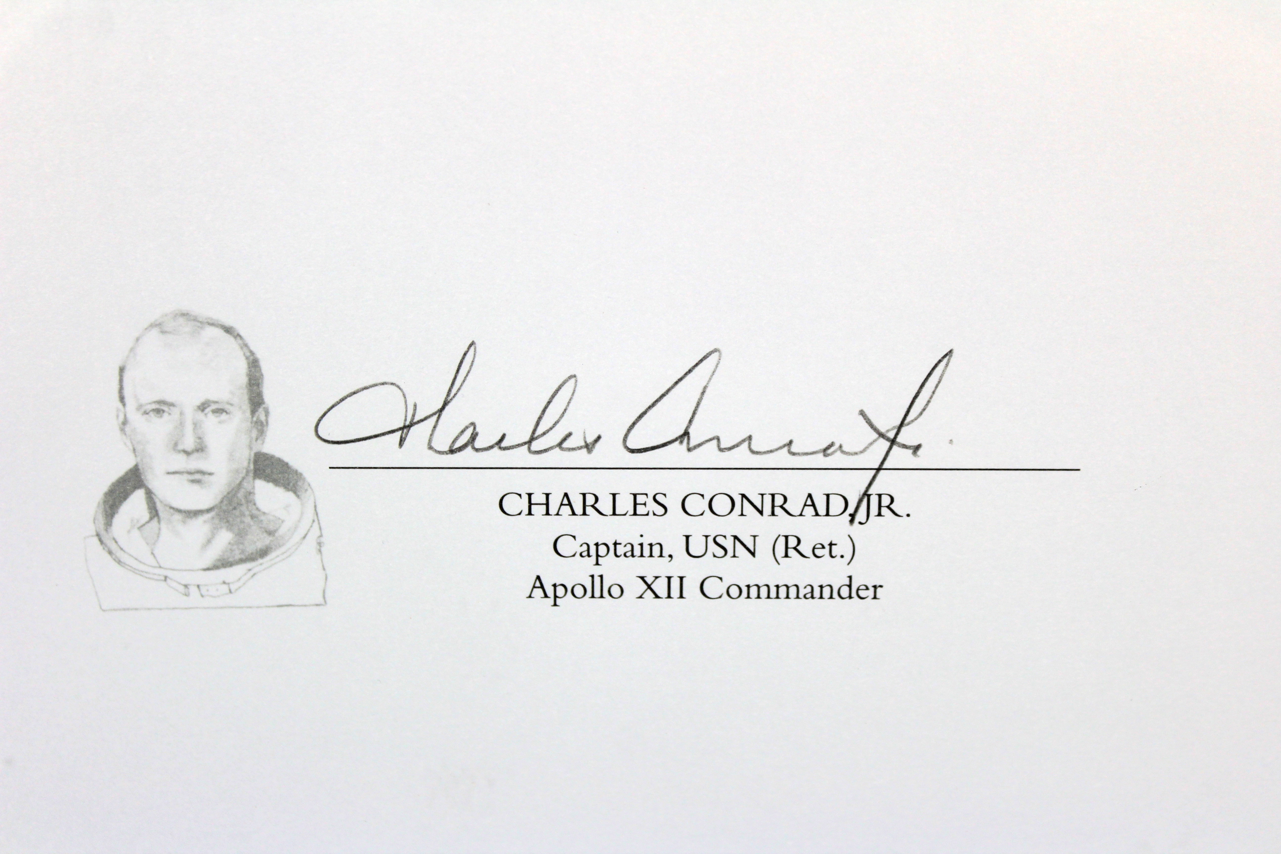 Custom frame measures 24" x 29" in size and features an art print that has been hand-signed in pencil pen by Alan Bean and Charles Conrad Jr. Please see photos for more information. Hand-numbered limited edition #145 / 850.