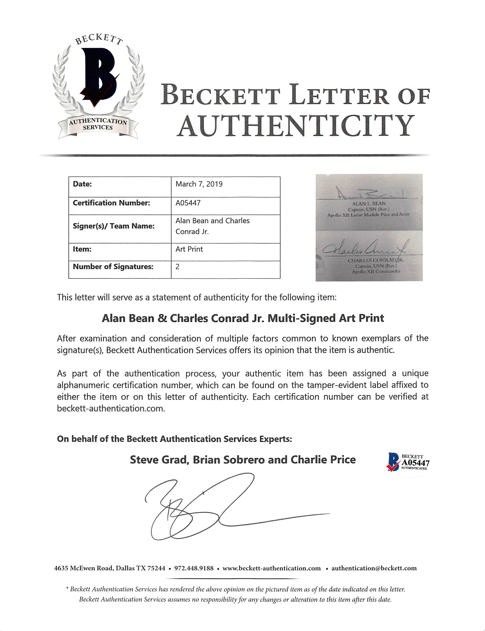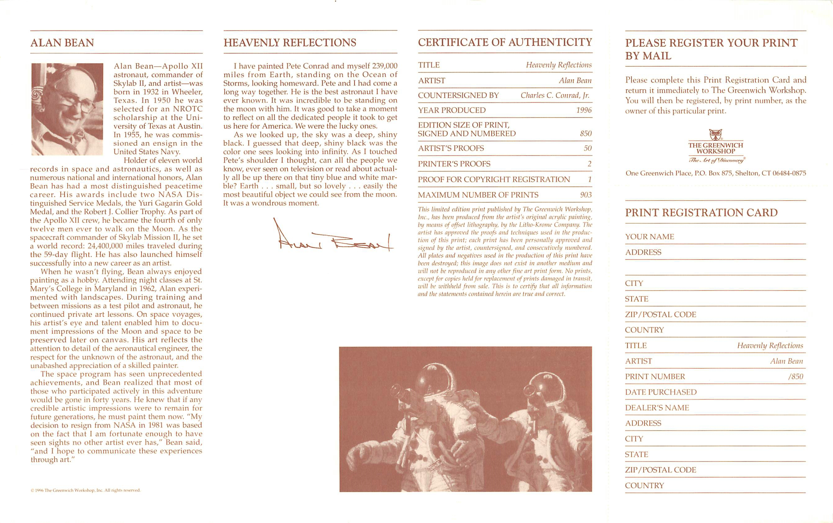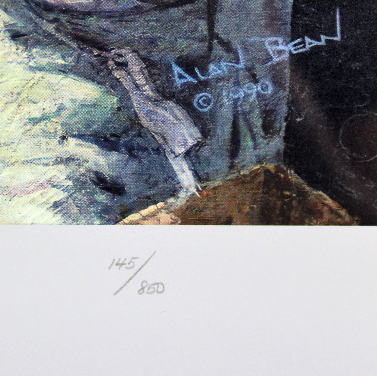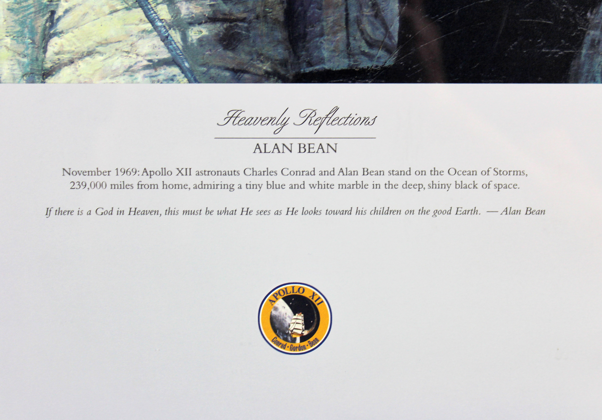 Custom frame measures 24" x 29" in size and features an art print that has been hand-signed in pencil pen by Alan Bean and Charles Conrad Jr. Please see photos for more information. Hand-numbered limited edition #145 / 850.
