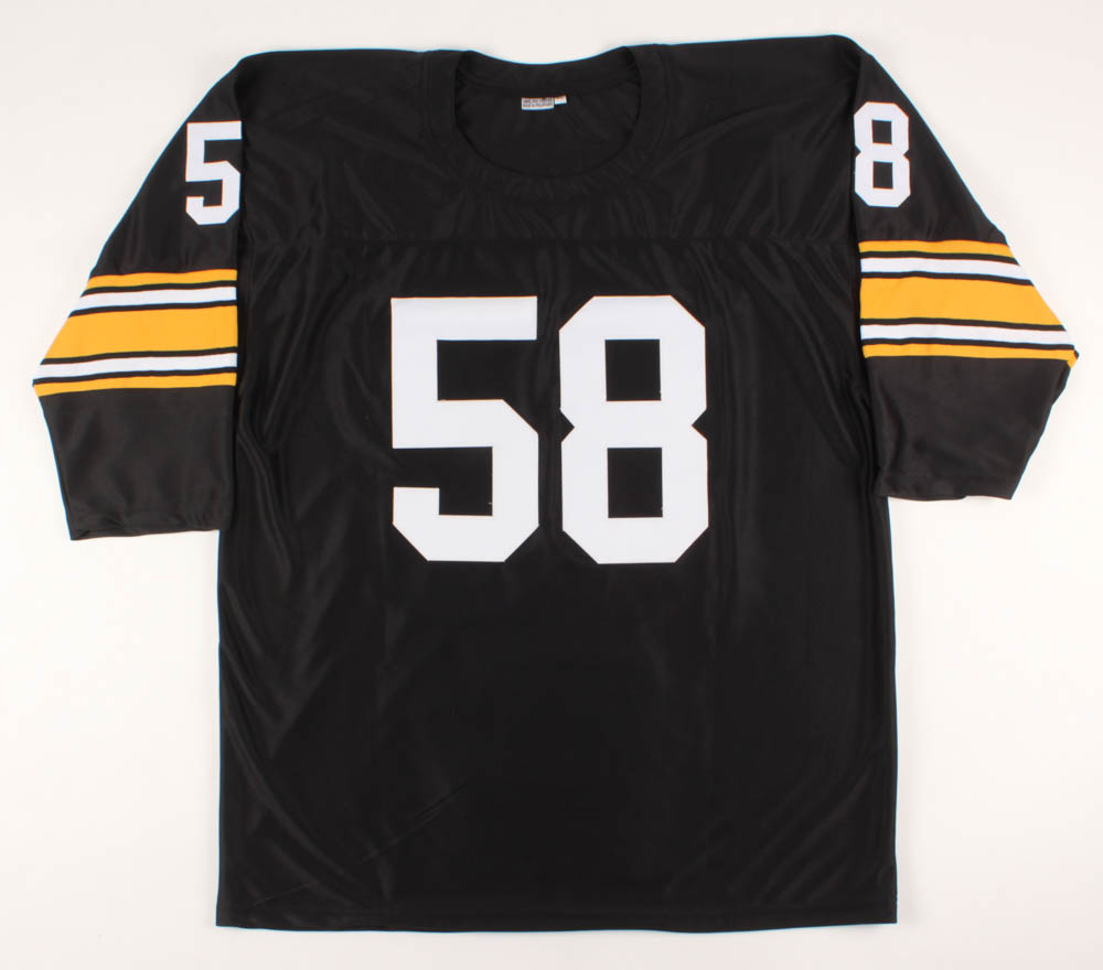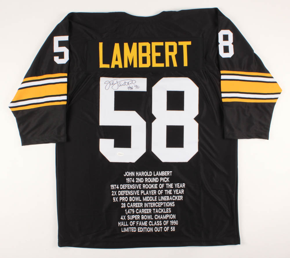 Custom on-field style jersey. Everything sewn on, size XL. Hand-signed in black felt-tip pen by Jack Lambert (HOF). Lambert's career highlights have been custom stitched onto the back of the jersey below the reverse numbers.