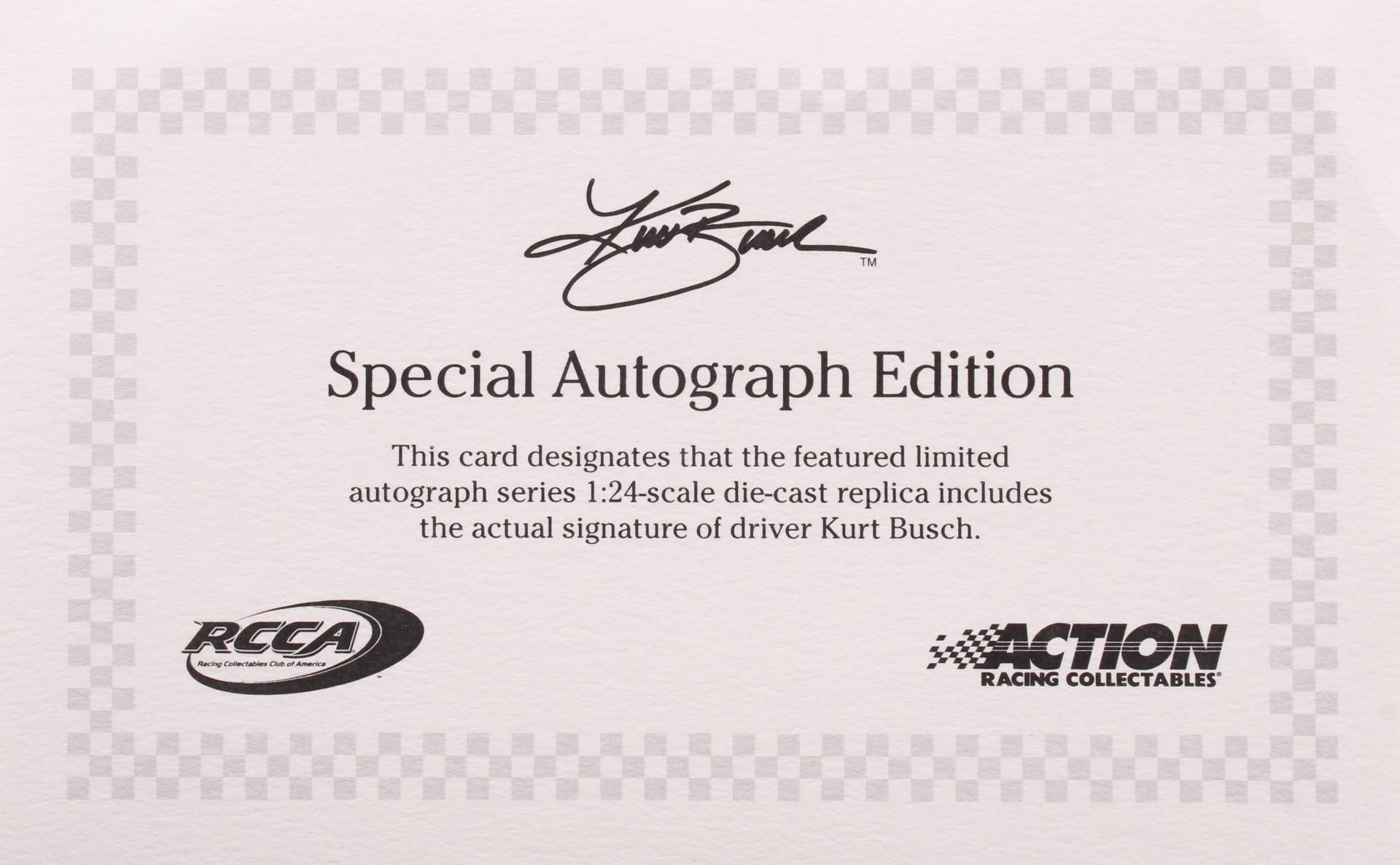 Premium die-cast car hand-signed in silver paint pen by Kurt Busch. The car is limited edition to just 120 produced and includes the original packaging.
