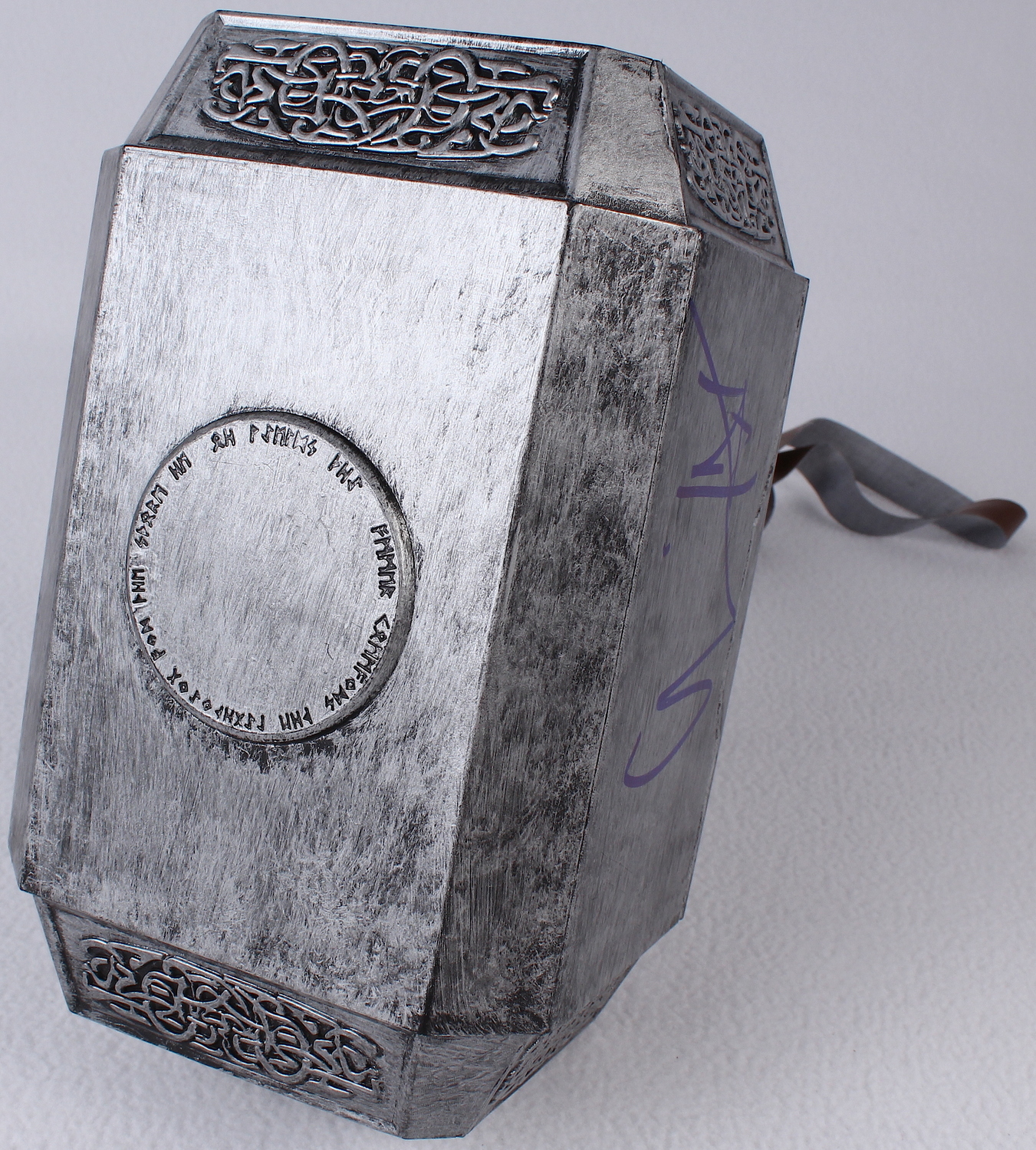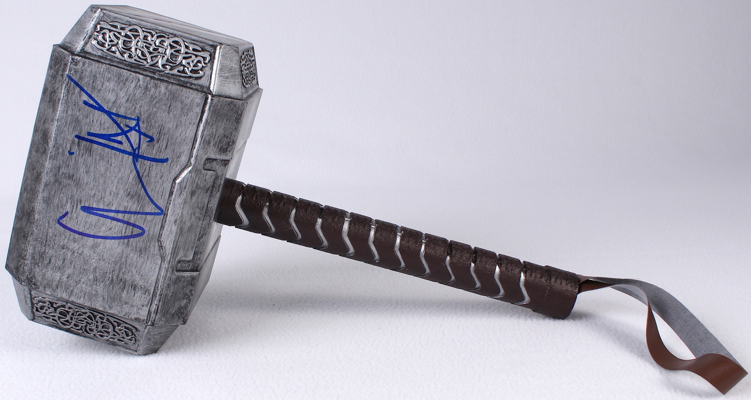 Full-size Thor movie prop replica. The prop is made of plastic and measures approximately 15" in length and 9" in width. Hand-signed in blue felt tip pen by Chris Hemsworth. The autograph includes an LOA and lifetime authenticity guarantee from Pristine Auction.
