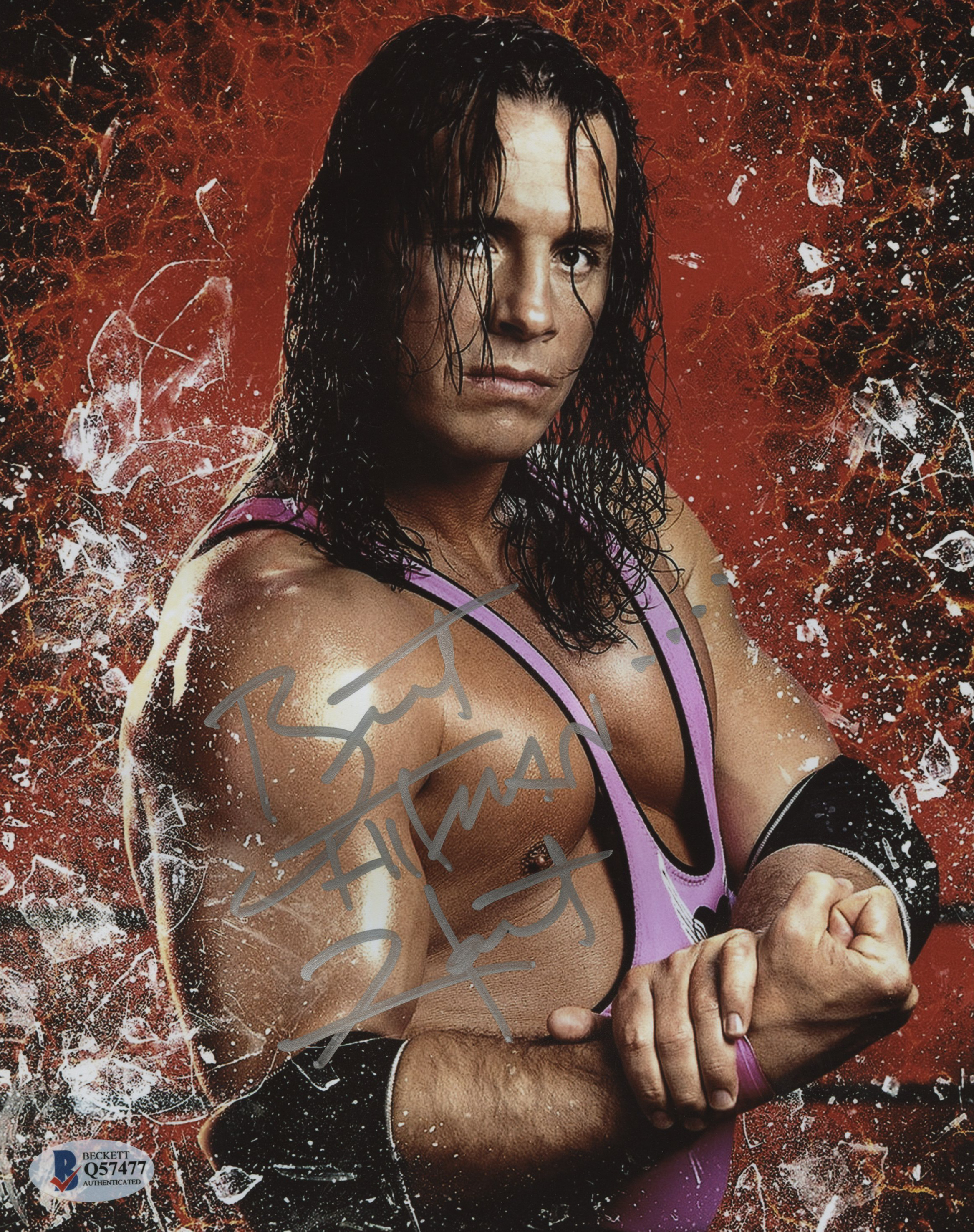 Photo measures 8" x 10" in size and has been hand-signed in silver paint pen by Bret Hart (HOF).