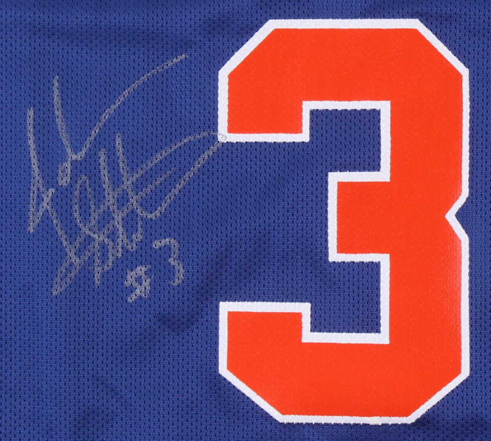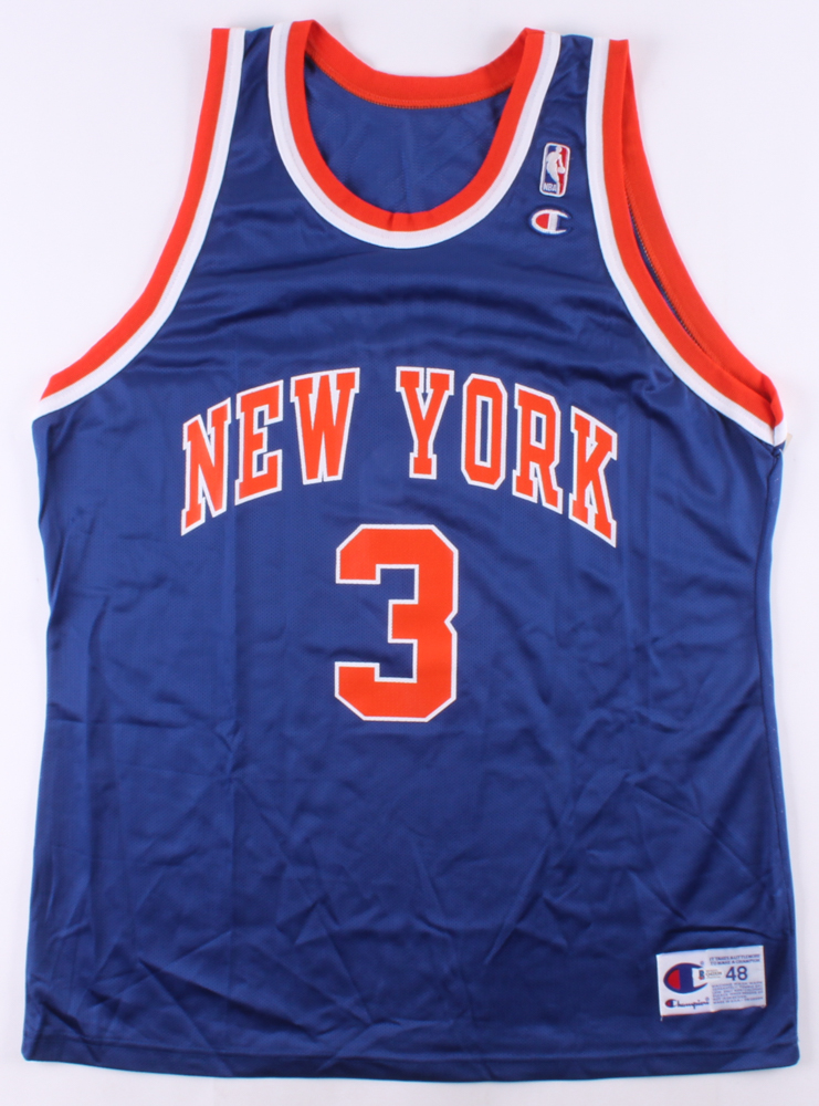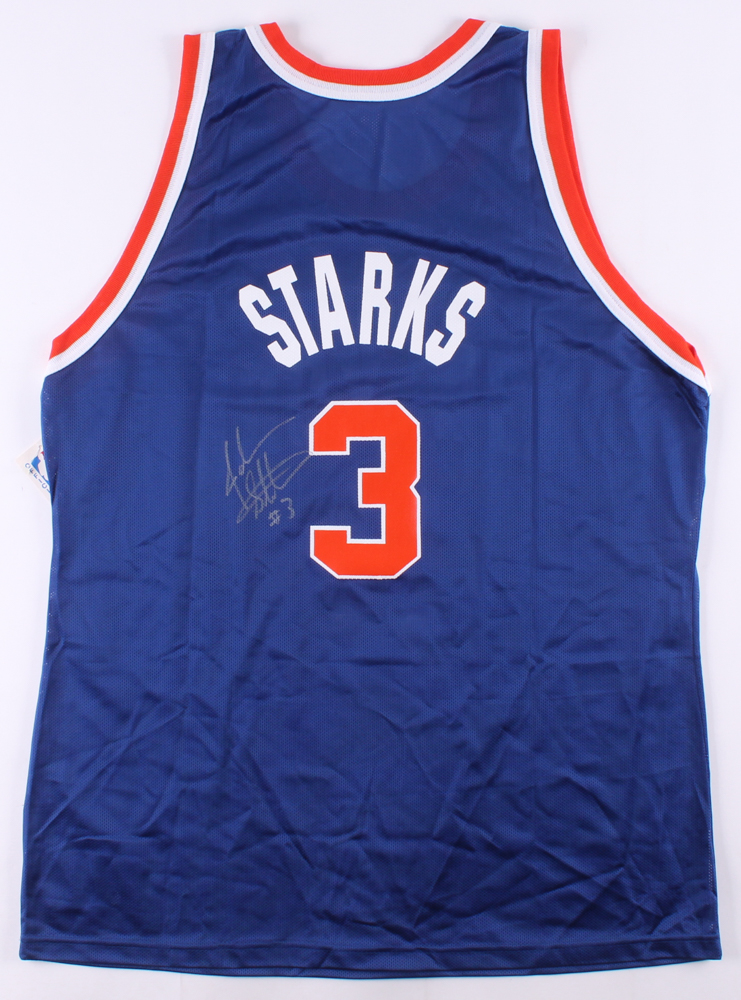 Champion on-court style jersey. Everything is sewn on, size 48. Hand-signed in silver paint pen by John Starks.