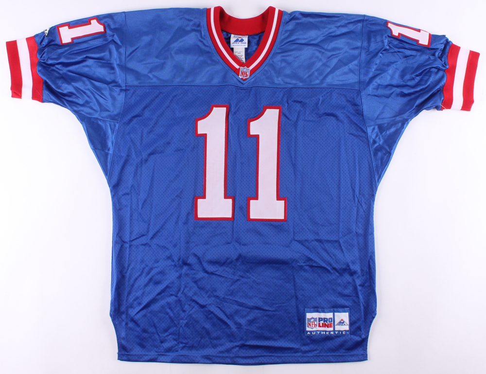 Pro Line on-field style jersey. Everything is printed on, size L. Hand-signed in black felt-tip pen by Phil Simms.