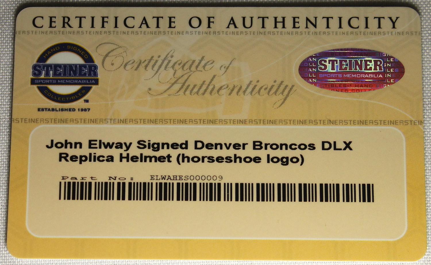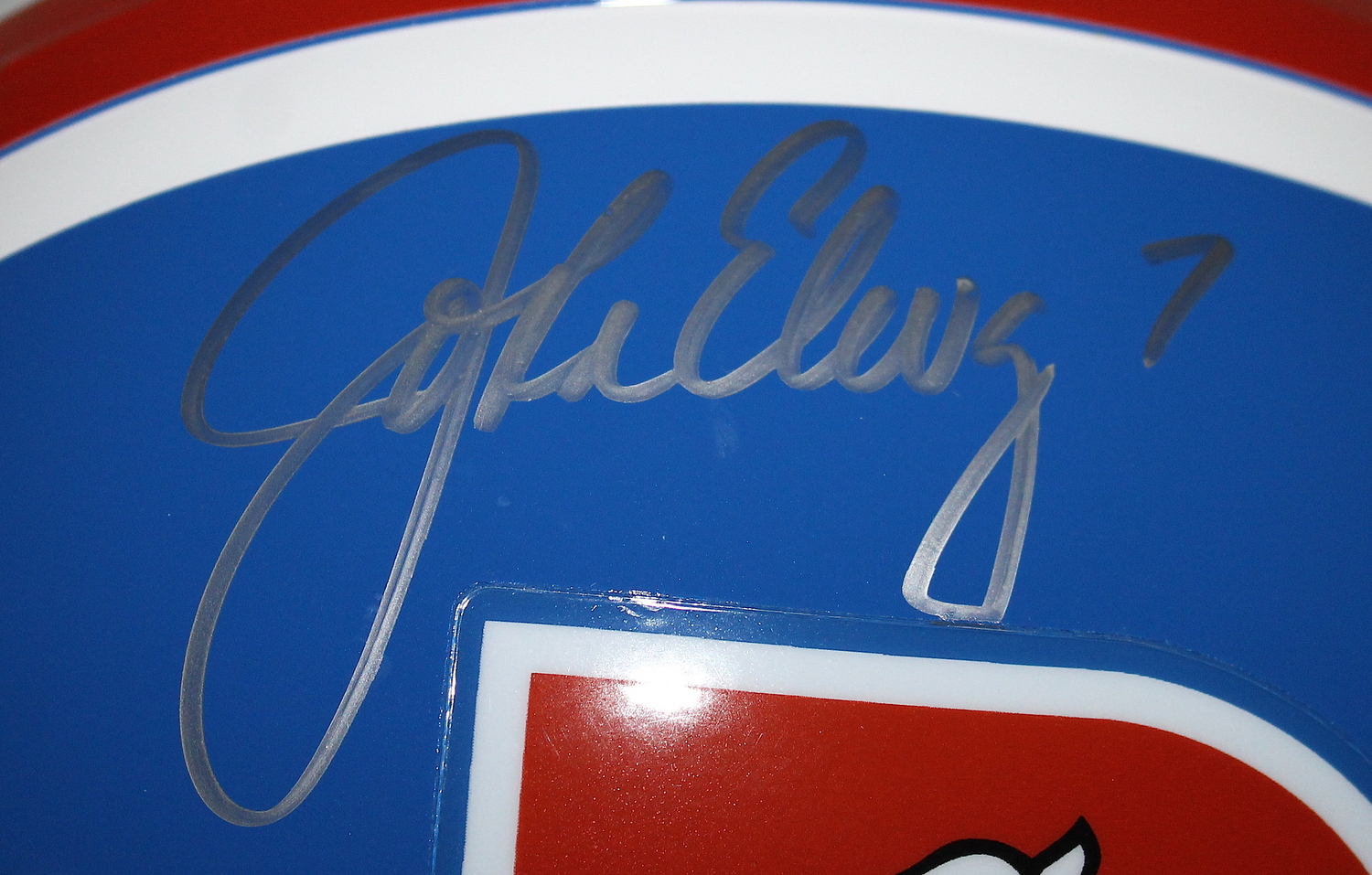 Riddell full-size replica. Throwback helmet hand-signed in silver paint pen by John Elway (Broncos HOF). The autograph includes an official Steiner hologram and matching COA for authenticity purposes.