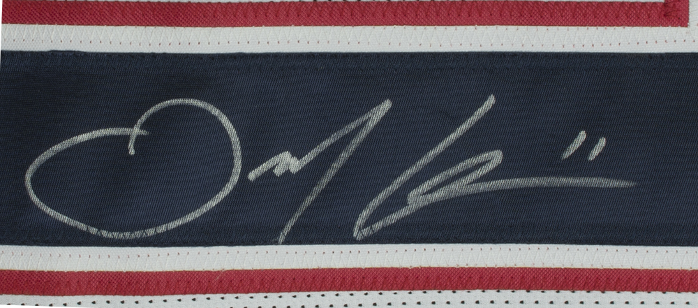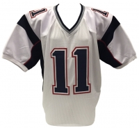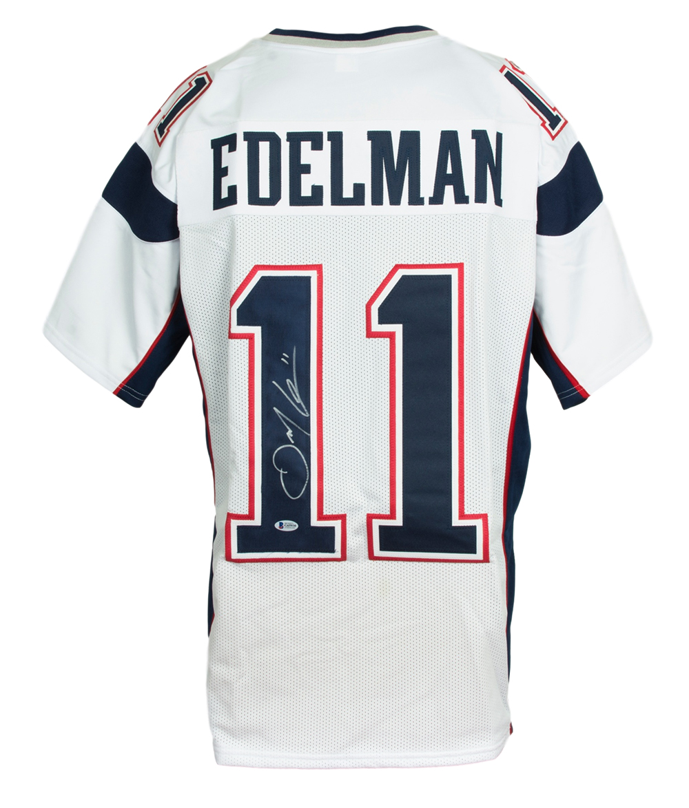 Custom on-field style jersey. Everything sewn on, size XL. Hand-signed in silver paint pen by Julian Edelman.