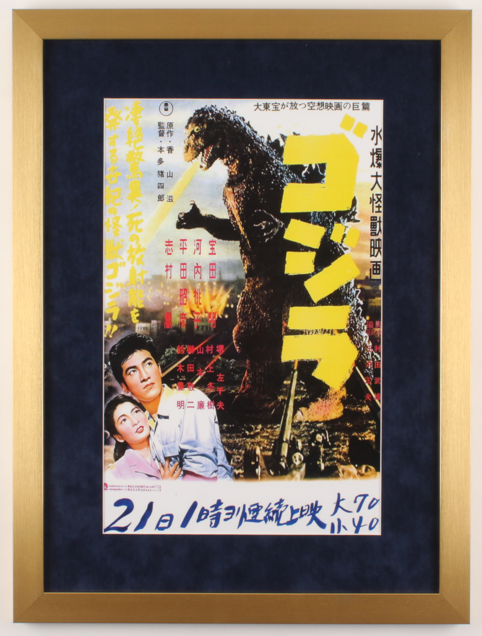 Custom framed display measures 17.5" x 23.5" in size and features a Godzilla Japanese themed movie print. Please note, the poster is not signed and is Japanese themed.